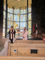 At the Santa Anita Church, a lovely stained glass window behind the altar looks like feathers or leaves. The officiant led a truly non-denominational ceremony that stressed commitment and kindness. There was no homily, but good advice for us all in the words exchanged by the bride and groom. The young couple chose simple vows, an exchange of roses, and lighting candles as symbols of their shared future. It made a unique and moving wedding.