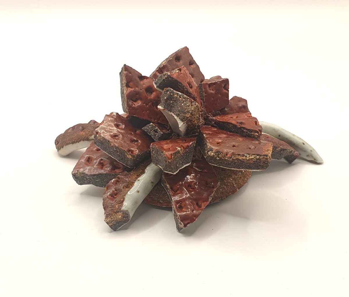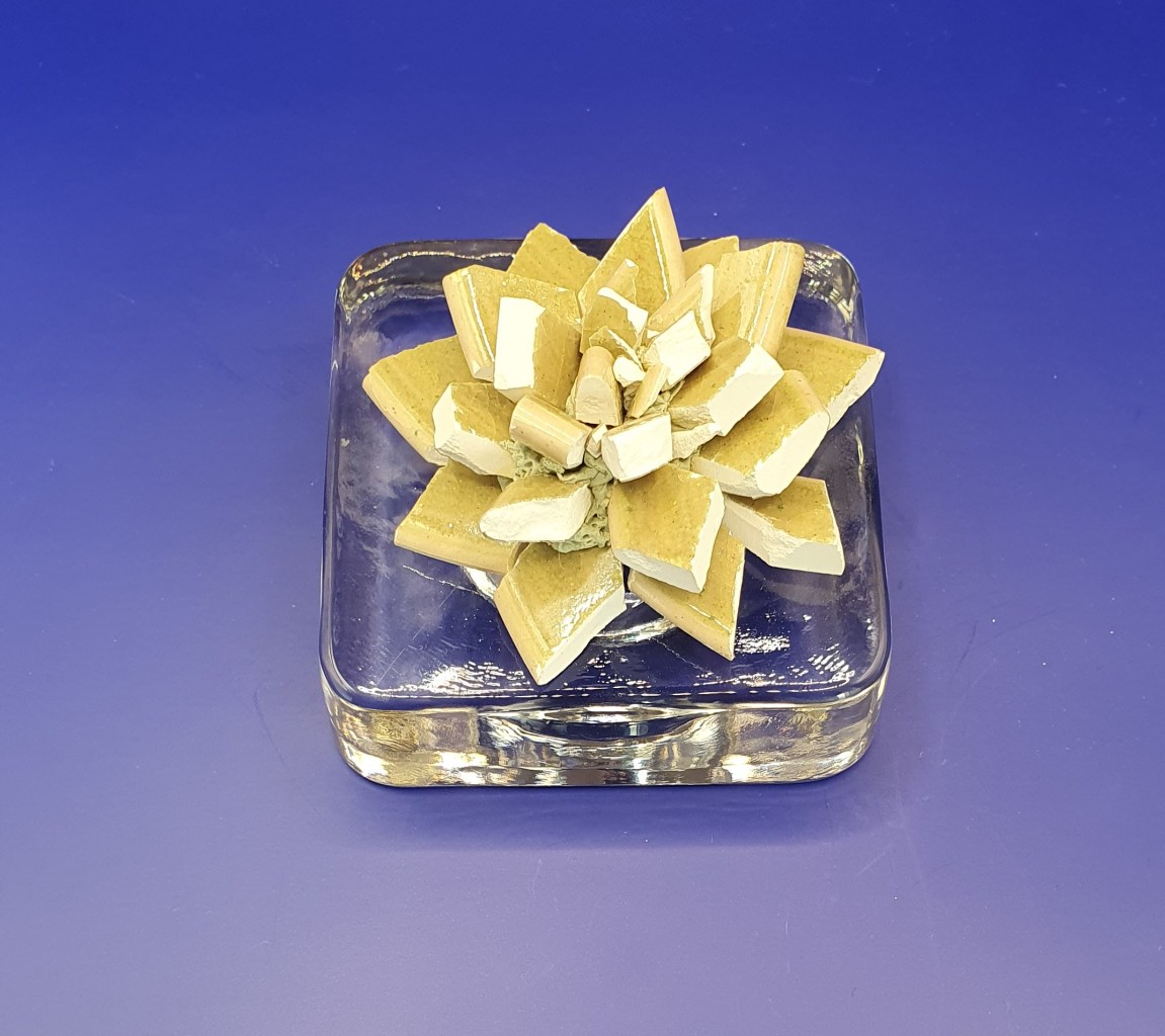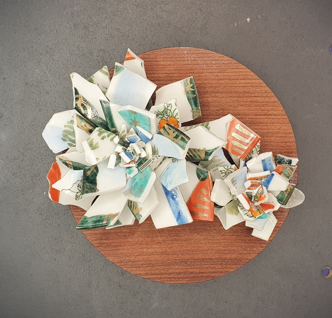 This is the first time I’ve entered an exhibit with something that was not a piece of jewelry. For a few months, I’ve been making mosaic flowers and succulents from broken china after taking a class from Cheryl Cohen. I don’t recall how I found her, but I was captivated by her projects. Her studio is in Holliston, MA, but there’s an online video version of her class that worked very well. https://cherylcohenmosaics.com/ I like making new things out of broken ones, and chipped and broken pottery is easy to come by. The local tradition of “free piles” on the sidewalk yielded everything I use.