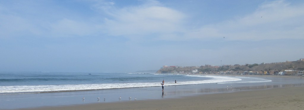 *We take one dog for a walk on her leash every day. We have another dog who has lost or gotten rid of every collar we’ve ever put on him. Though we try to keep him in the yard, Ruffo escapes as often as he can, and he cannot be caught. We’ve tried. He’s fast, and wily. When he’s ready to come back, he comes to one of the doors and paws it. Before then, no inducement works–Ruffo is well known along the beach. I may not be a fan of the Peruvian system that lets dogs run wild, but I have a dog that participates.