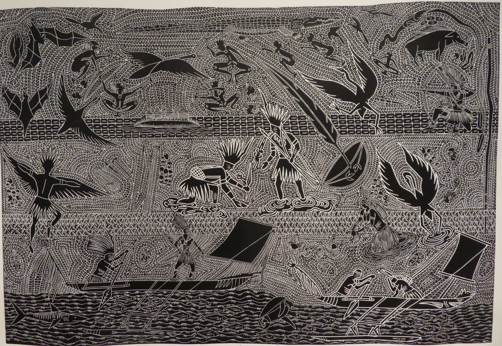 Paintings are the best known form of aboriginal art in Australia, in part because there is ancient rock art painted in similar styles. We were drawn to different work, especially the linocuts of Vincent Babia. These are his interpretation of the historic migration of people from Sabia Island in the Torres Straits to Cape York, the northern tip of Australia. There is a lot going on in every corner of his prints. They are very large, this one is 121.5 x 97.5 cm (38 x 48 in).