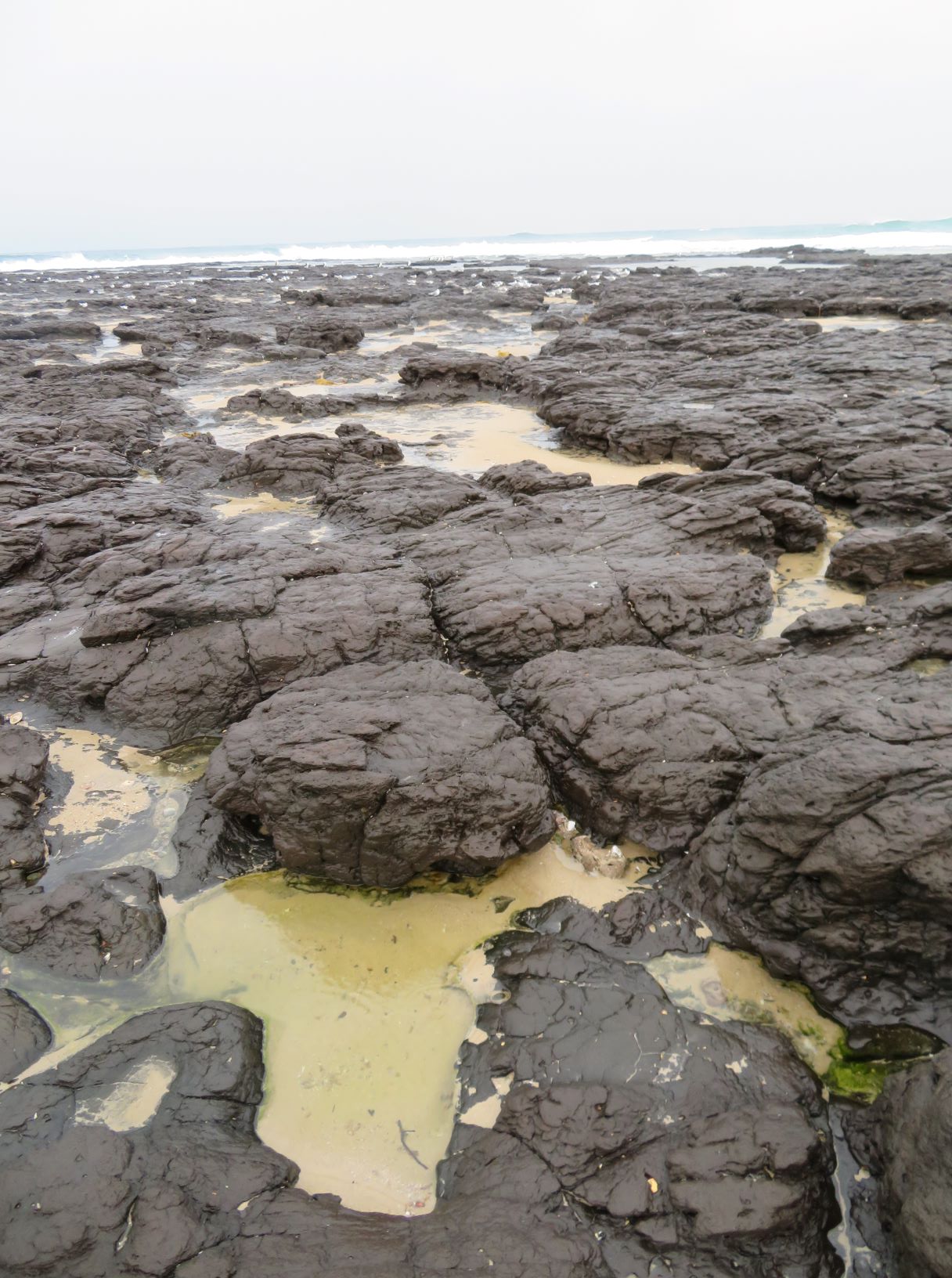 There is a low spot separating Fingal Head from the shore. It was just past low tide, and as I considered crossing onto the heap of rock, a wave crashed into the low spot from both directions at the same time!