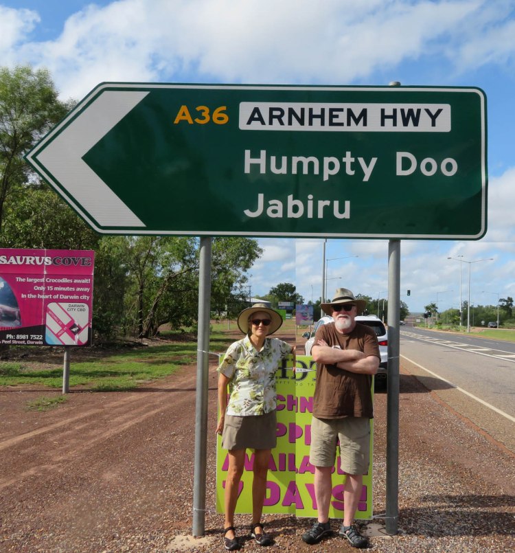 The Darwin area is best known as the gateway to Kakadu National Park, but a visit requires at least one night away from home and a healthy hike in the heat. Instead, we drove out to have coffee in Humpty Doo. With a name like that, it was a must see. Beyond Humpty Doo, we stopped at the Fogg Dam nature preserve, an excellent place for bird-watching. There were crocodile warning signs all along the road, and I was happy not to see one.