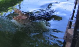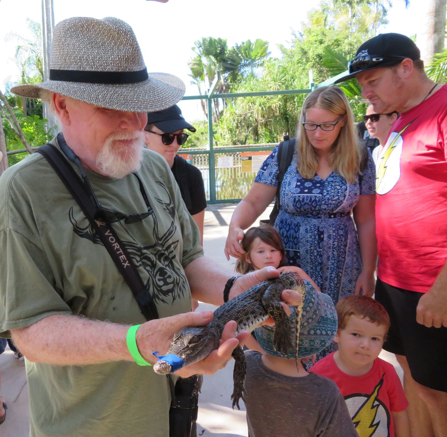 For a close up with crocs, we visited Crocodylus Park on our final day in Darwin. Crocodiles are a hazard in this region, but they are also protected. A recent article suggested that Australia’s success in protecting crocodiles has resulted in an increase in crocs as far as New Guinea and Indonesia. Sounds like a mixed blessing. Crocodile breeding is big business and relies on wild crocs to provide lots of eggs. During the egg-laying season, collectors with special permits collect thousands of crocodile eggs from nests and bring them to facilities where they are raised in controlled temperatures, since precise temperature differences result in the hatching of males vs. females. Males are the delicate ones, needing to incubate at around 88° F. Otherwise, hotter or colder, the hatchlings are female. Australia exports both salt water and fresh water crocodiles, and croc skins for fashion products. I almost fell for a croc clutch for only AU$200. Then I thought, When would I carry it?