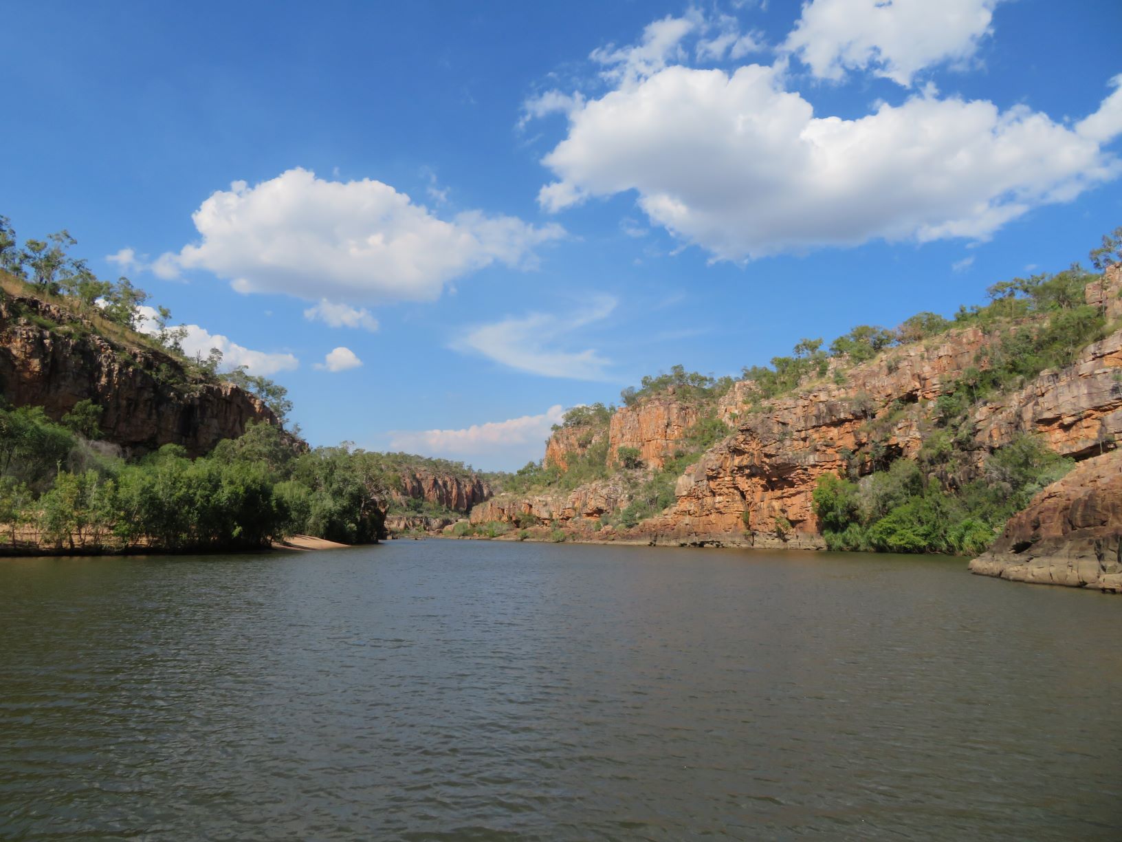 This time, the trip started on time, and after an early lunch–who doesn’t enjoy a dining car?–we stopped in Katharine, a mere 300 km down the road, for an afternoon visit to Katharine Gorge. We took the relaxing trip, a boat cruise along the sides of the gorge with a stop to look at aboriginal rock art. There is more spectacular rock art in Australia, but most of it requires a healthy hike in the high heat and humidity. I asked our boatman whether the holes in his hat were from a crocodile bite. (He laughed.) We did see a salt water crocodile on our cruise. They have a very pointed nose and are only 4-6 ft. long. They couldn’t even get your foot in their mouth…..
