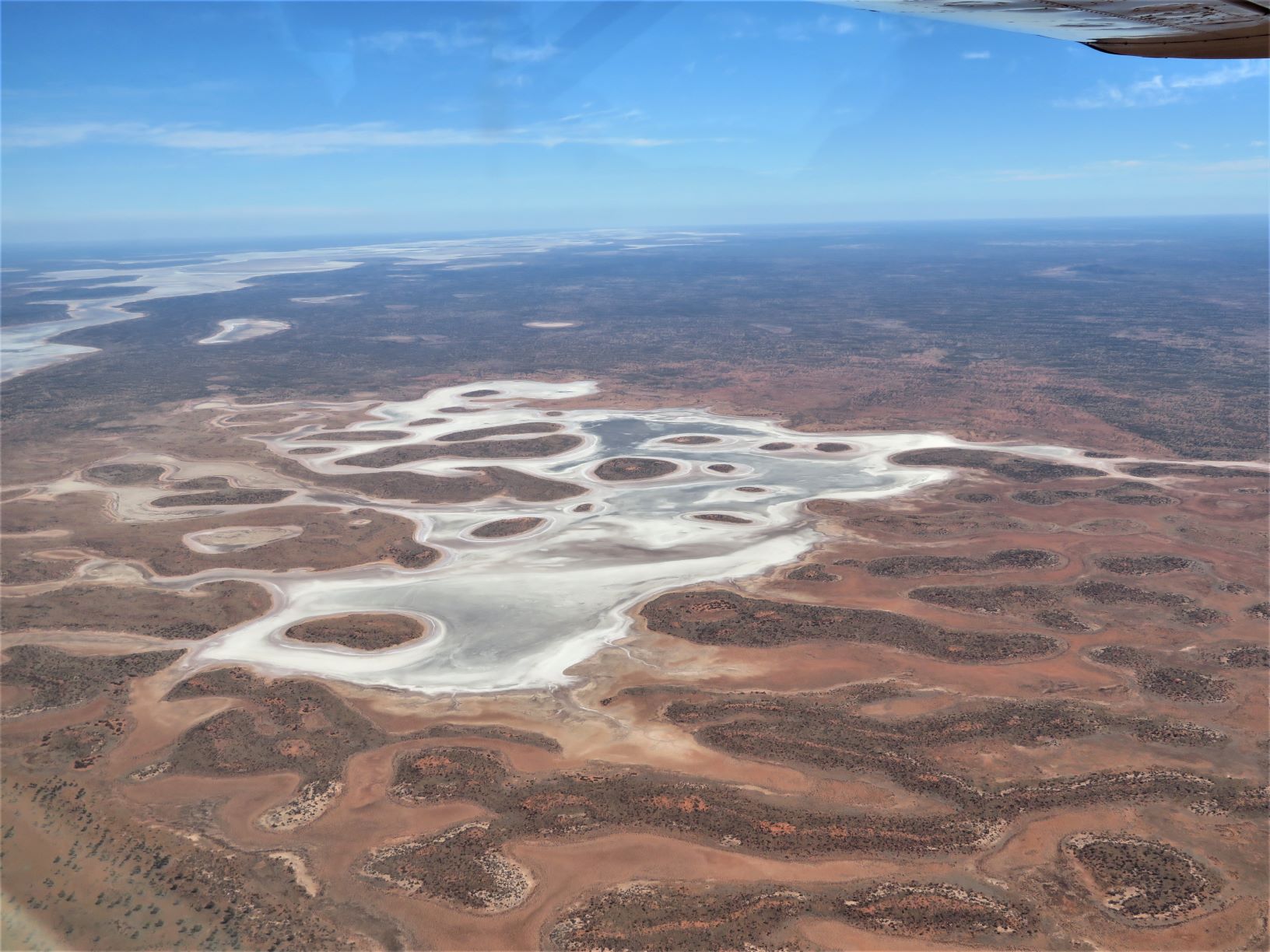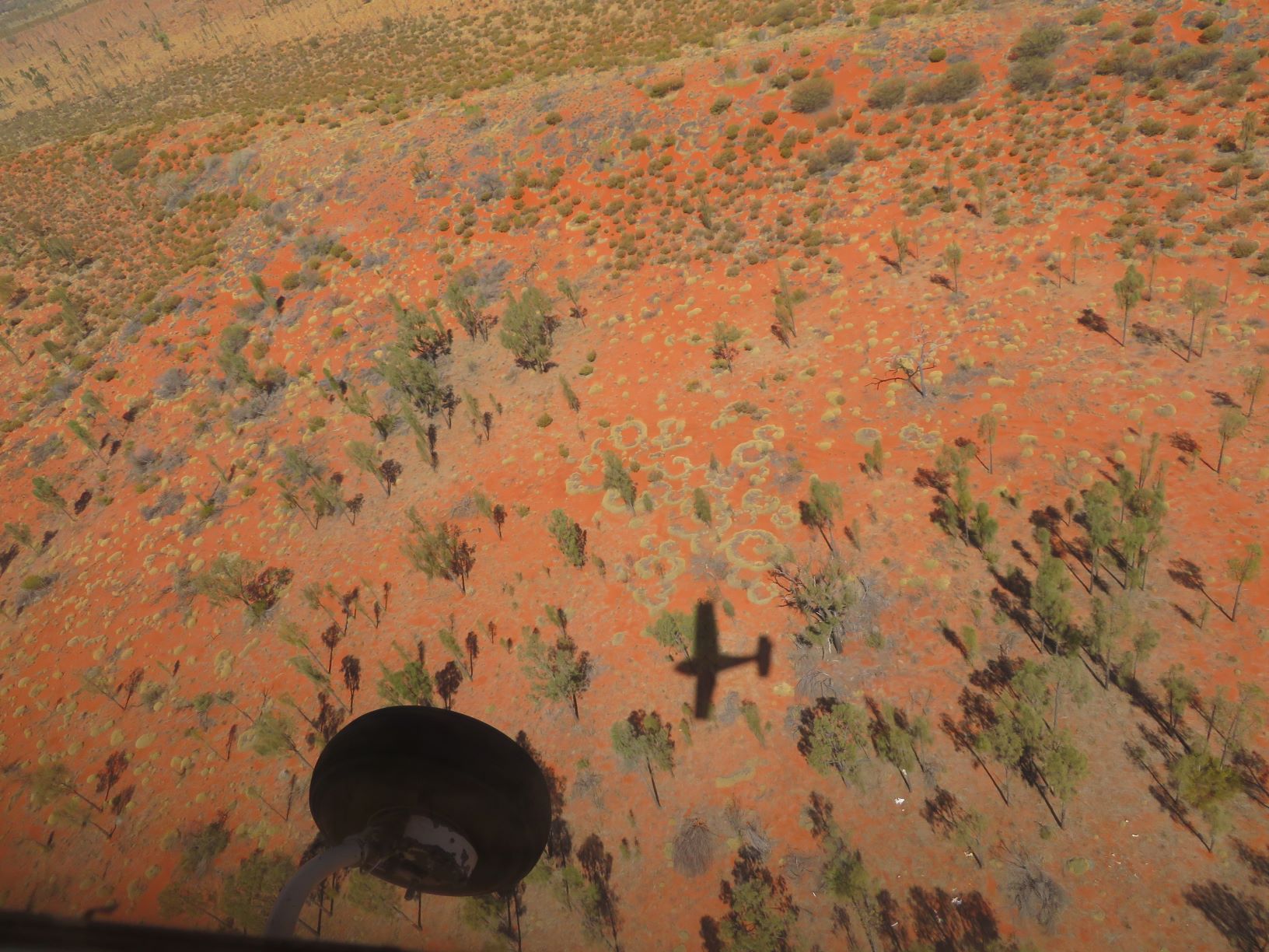 From the air, we finally saw The Outback. Not a bare desert, but a vast area of tan grasses, spindly gum trees, and lots of an invasive grass from S. Africa that we are assured no animal will eat. Parts of the Outback resemble the Sonoran Desert of Arizona and northern Mexico. What differs is its immensity. We flew more than 400 km and saw roads only at takeoff and landing. There was one town, Hermannsburg, a former mission. There was also Pine Gap. If you watch Netflix, you may have seen the new show set at the CIA/Australian joint spy base. Having seen a few episodes, it was a bit strange to actually see the field of white domes that covers the spying equipment. Beyond Pine Gap and Hermannsburg, we saw no isolated farmsteads, roads, trains, trucks, vehicle tracks, not even any animals. Somewhere below us was a cattle station of over one million acres, yet we saw no evidence of this. There were no fences, water tanks, windmills, air strips, the features of remote farms.