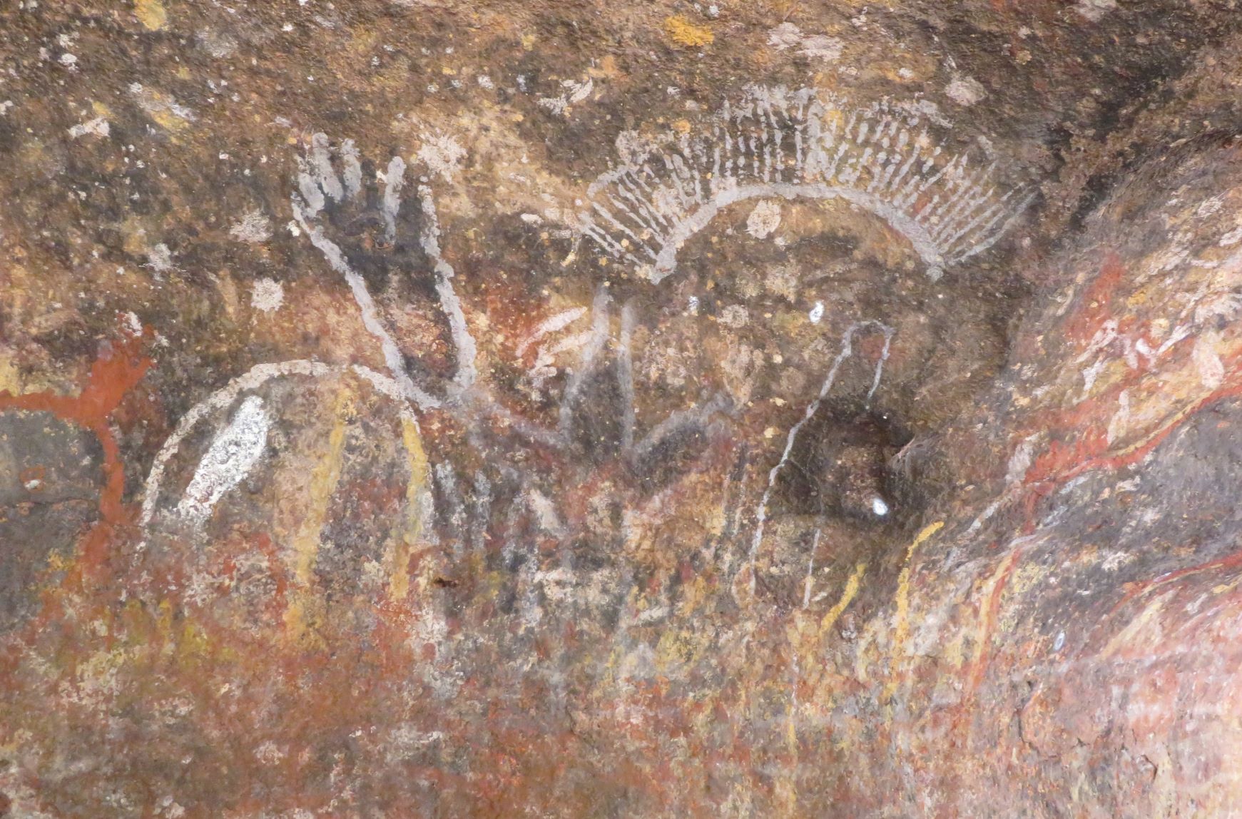 We are compressing a three day visit into one, our aerial outback tour followed by a picnic lunch on the ground at a shelter perfectly positioned to let us soak in Uluru while sitting in the shade. Next we walk to the Mutitjulu Waterhole with a stop at some rock art along the way. Everyone sees different things in the rock art.