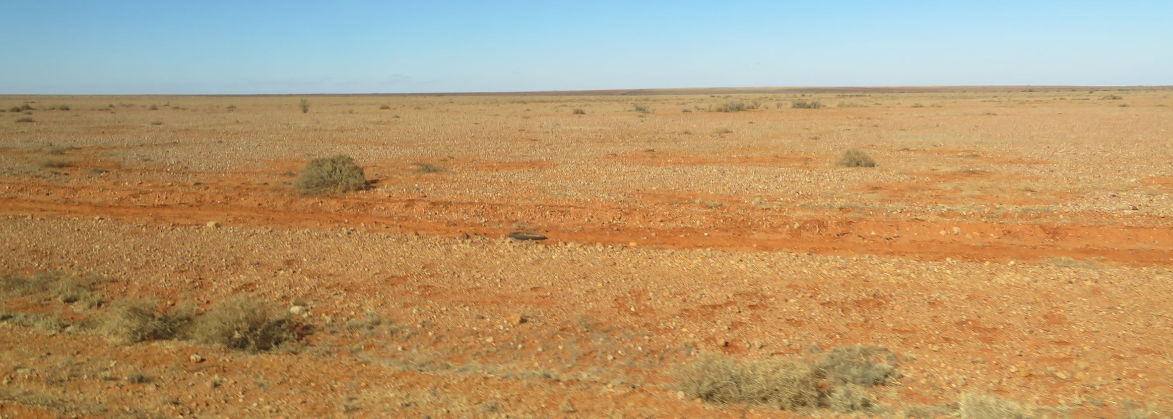 Geology and vegetation create the landscape. What looks like the green verges of a superhighway is a geological fault. A crack in the earth lets a bit of water escape and a streak of dark green trees emerges. Pale earth is peppered with green shrubs, alongside an empty river cut through rock. An irregular band of white pools crossed our route, a dry river of salt, hundreds of thousands of tons too remote to mine. Straight lines on the ground are bands of red, ochre, and tan stone lying one beside the next, straight as an arrow, or bending in parallel lines created eons ago. On the distant horizon rounded hills suggest this flat plain eventually ends.