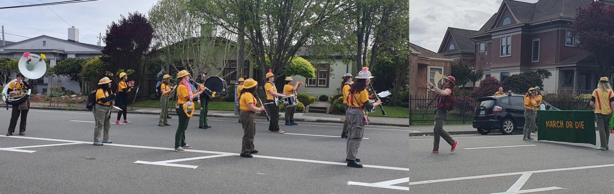 The Grand Championship is a three-day event, starting on Saturday morning at the Arcata Plaza. Throngs of people mob the plaza and surroundings, many wearing costumes. You don’t have to be affiliated with any particular entry, everyone is welcome, encouraged, to wear something outrageous. Men wear Barbie pink, women wear gold lamé, people wear rainbow wigs, black goth outfits, face paint, or just show off their tattoos.