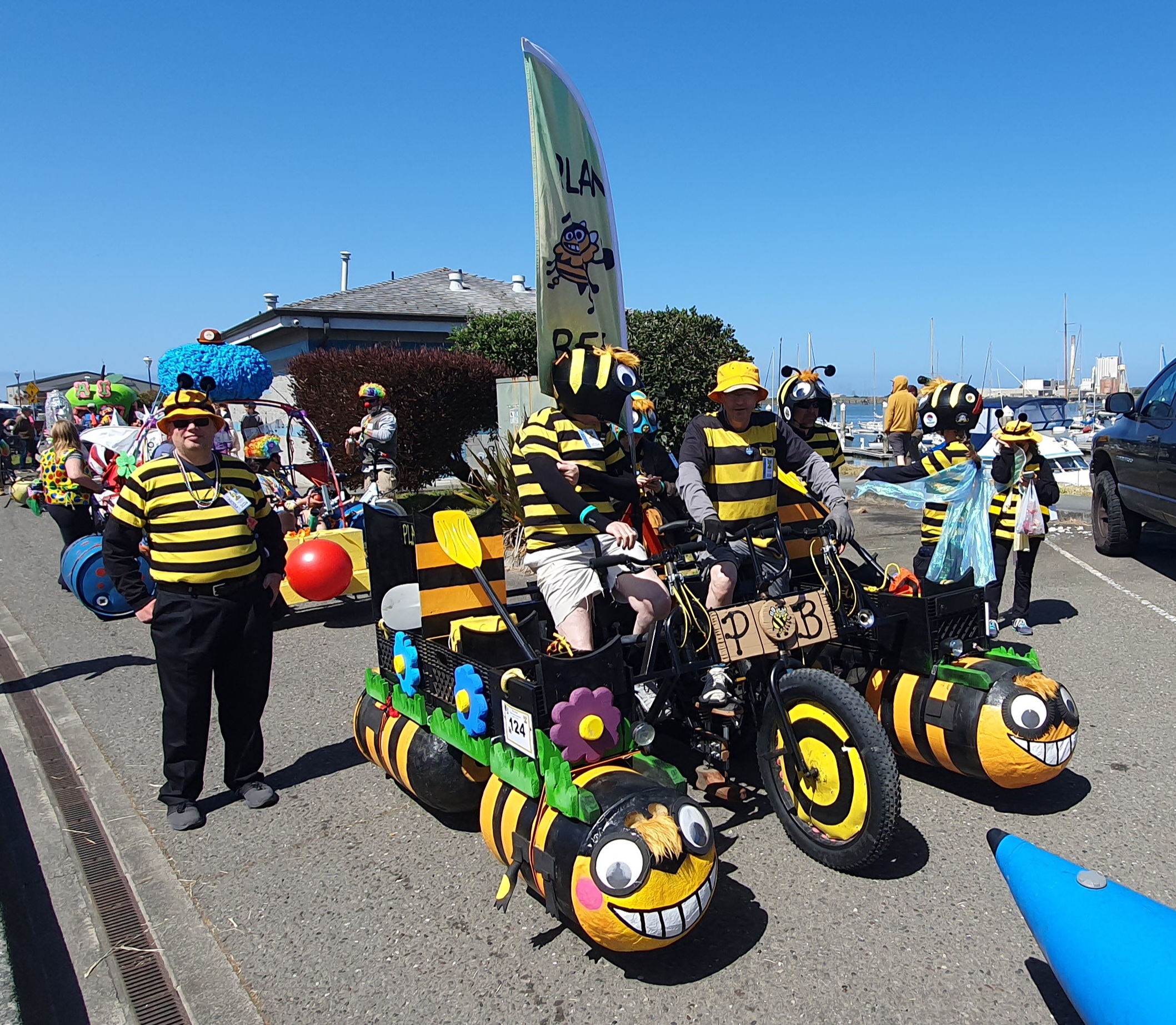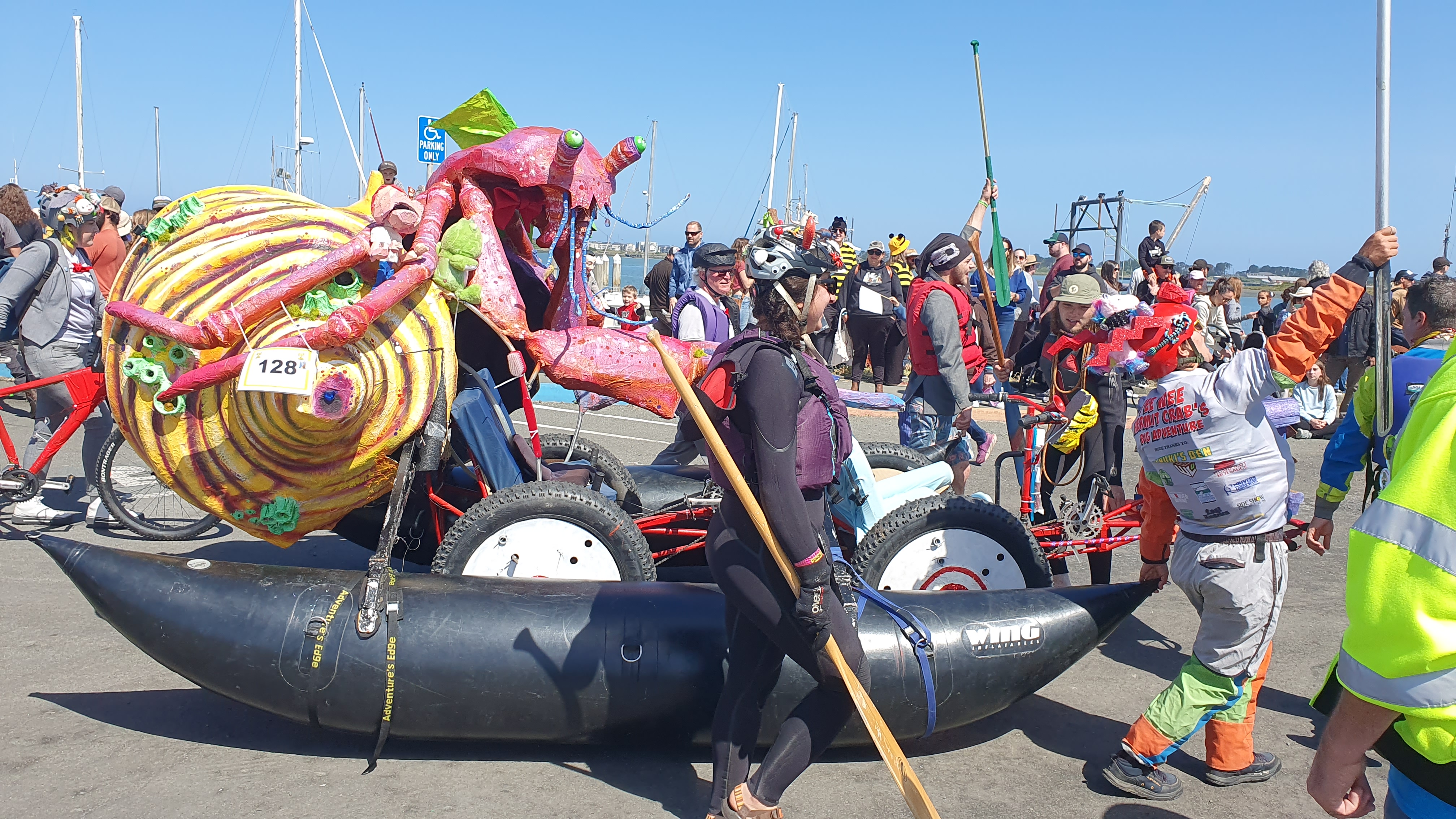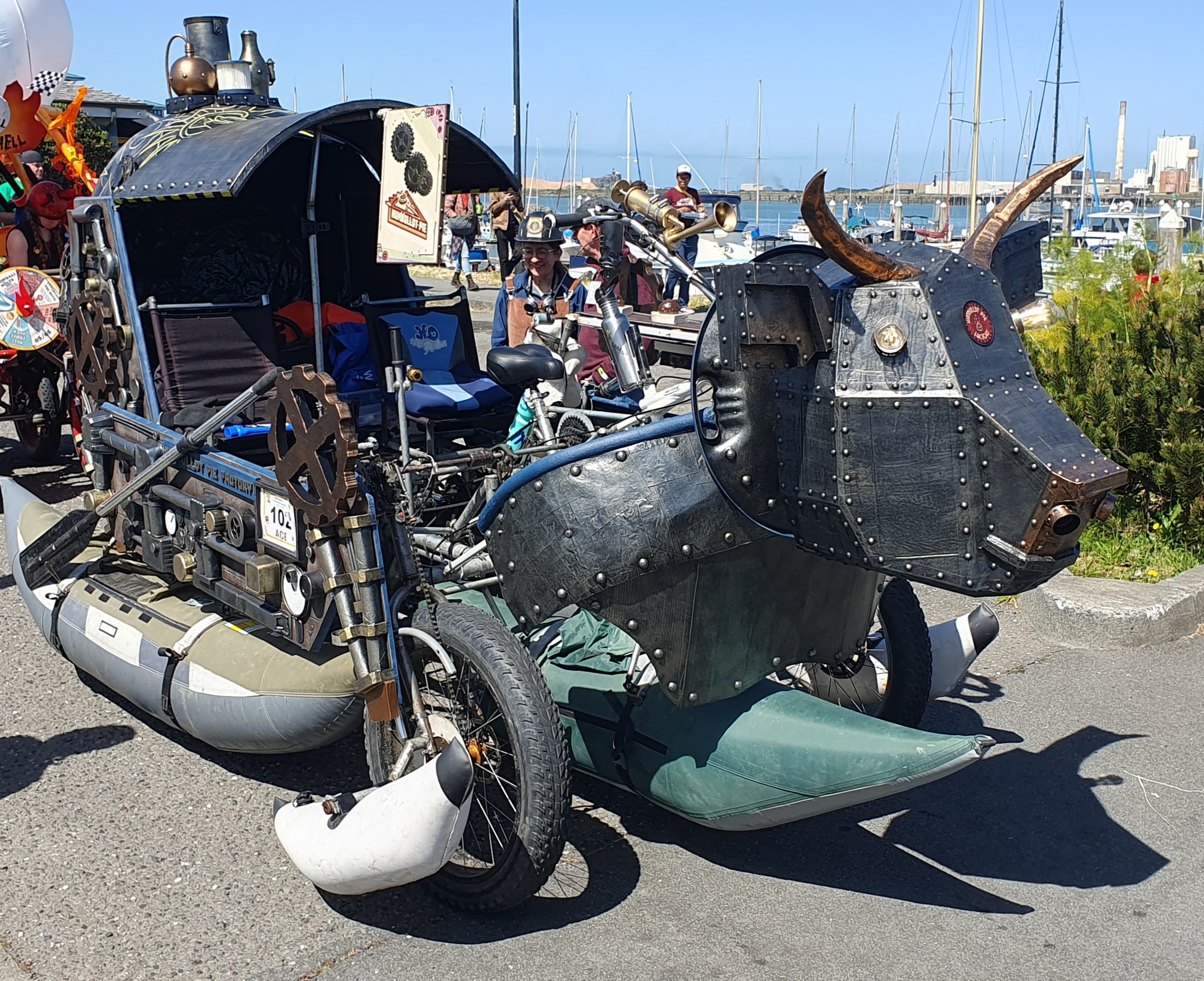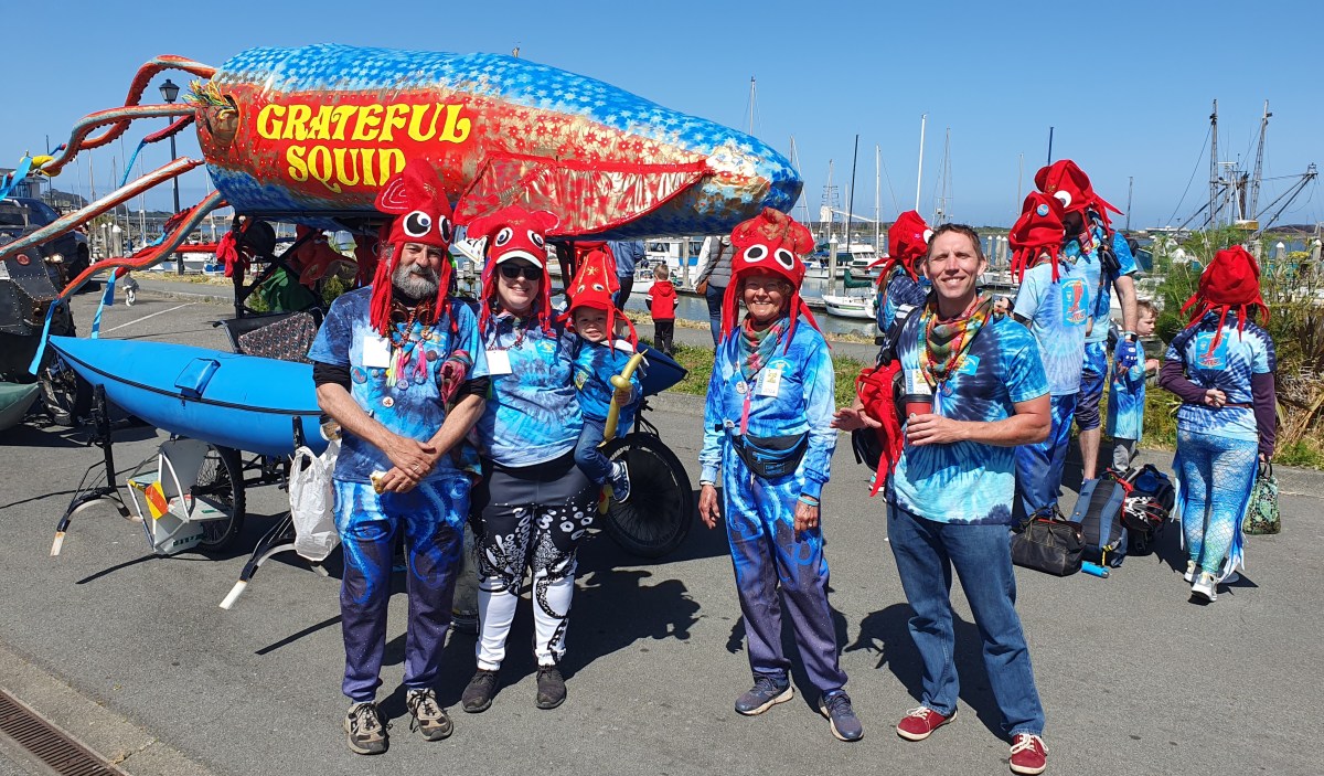 Day 2 takes entries into the water, where they paddle about 500 yards along the shore of Humboldt Bay, waving to spectators. The water is full of kayaks, paddleboards, and other boats full of watchers. Getting into the water is a big test, as each sculpture’s propulsion system has to be converted from moving tires on roads to moving water with paddles. Pontoons, kayaks, barrels, and other devices are used to make this happen. The line of sculptures waiting their turn to enter the water is a great place to take photos. I got a nice group picture of the Grateful Squid team. Sadly, when it was their turn to enter the water, the Grateful Squid itself made them top-heavy, dug its nose (?) into the water and stopped them in their tracks. (I spoke to a team member later and found they made it into the water on their second try.)