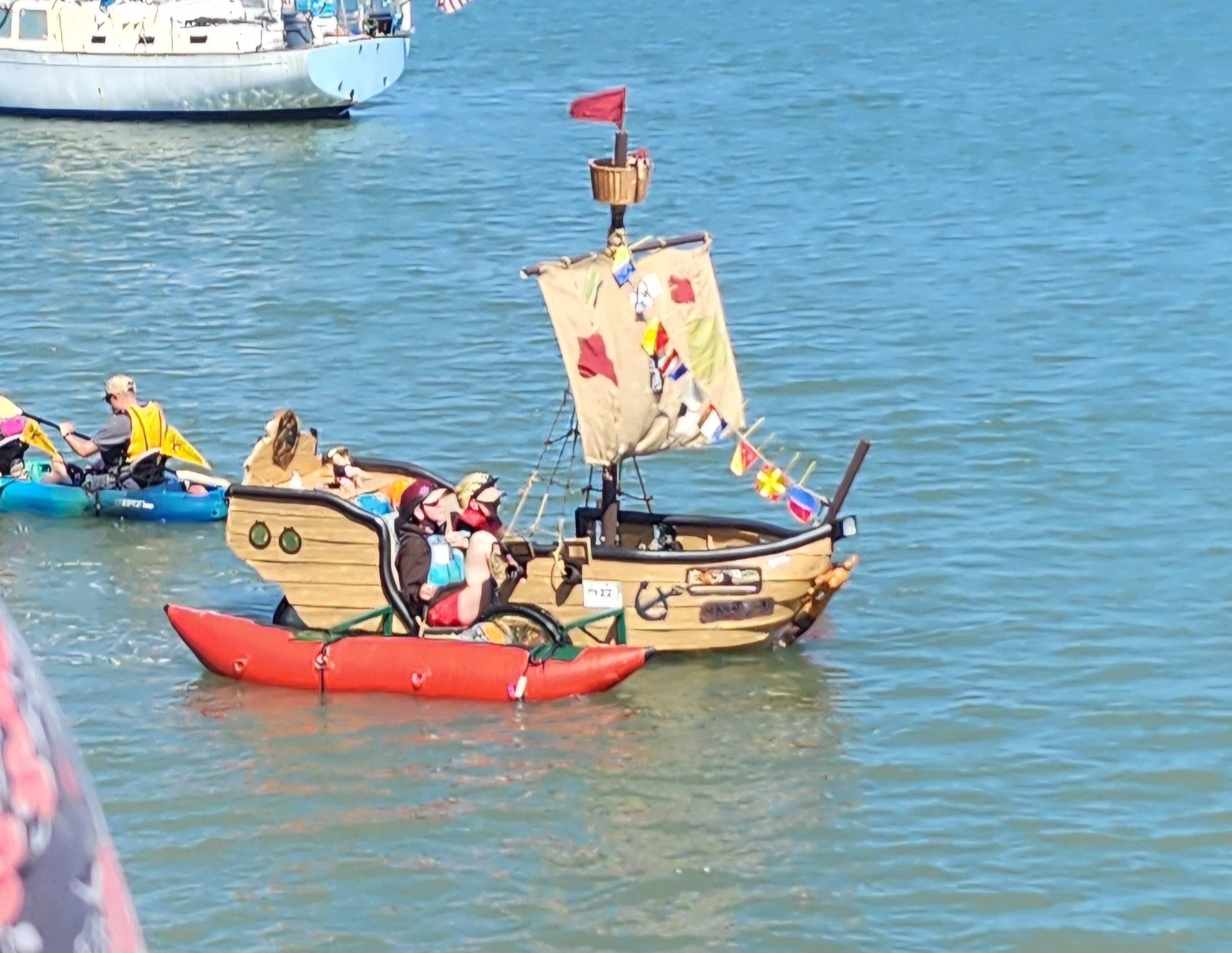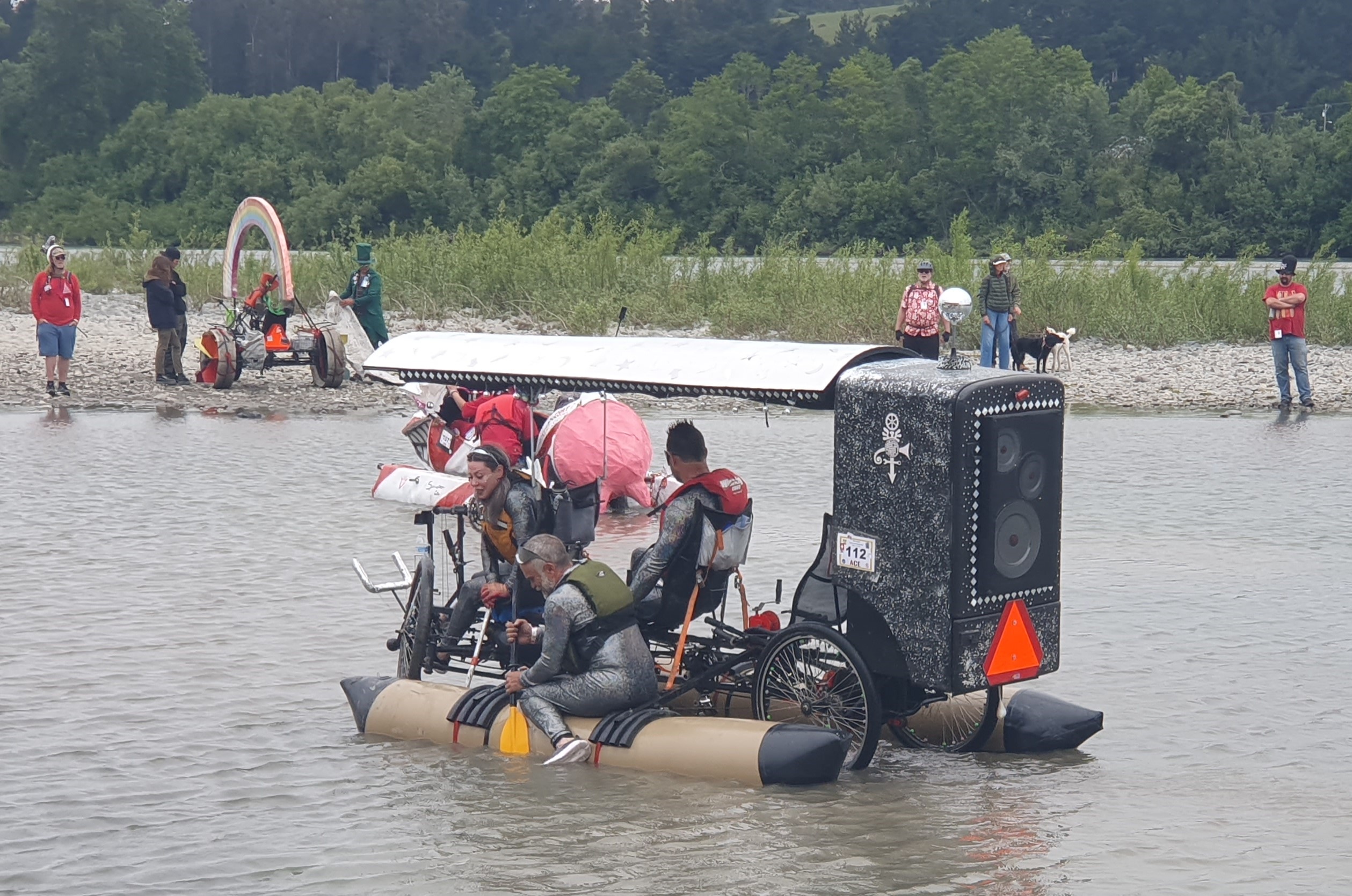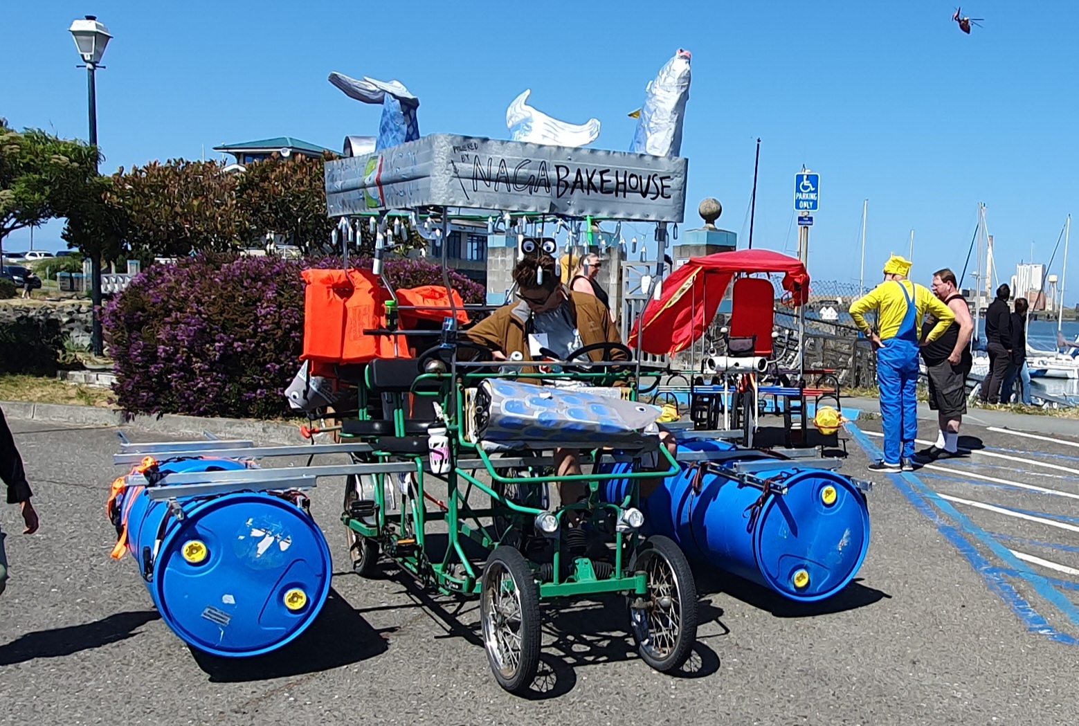 Day 2 takes entries into the water, where they paddle about 500 yards along the shore of Humboldt Bay, waving to spectators. The water is full of kayaks, paddleboards, and other boats full of watchers. Getting into the water is a big test, as each sculpture’s propulsion system has to be converted from moving tires on roads to moving water with paddles. Pontoons, kayaks, barrels, and other devices are used to make this happen. The line of sculptures waiting their turn to enter the water is a great place to take photos. I got a nice group picture of the Grateful Squid team. Sadly, when it was their turn to enter the water, the Grateful Squid itself made them top-heavy, dug its nose (?) into the water and stopped them in their tracks. (I spoke to a team member later and found they made it into the water on their second try.)