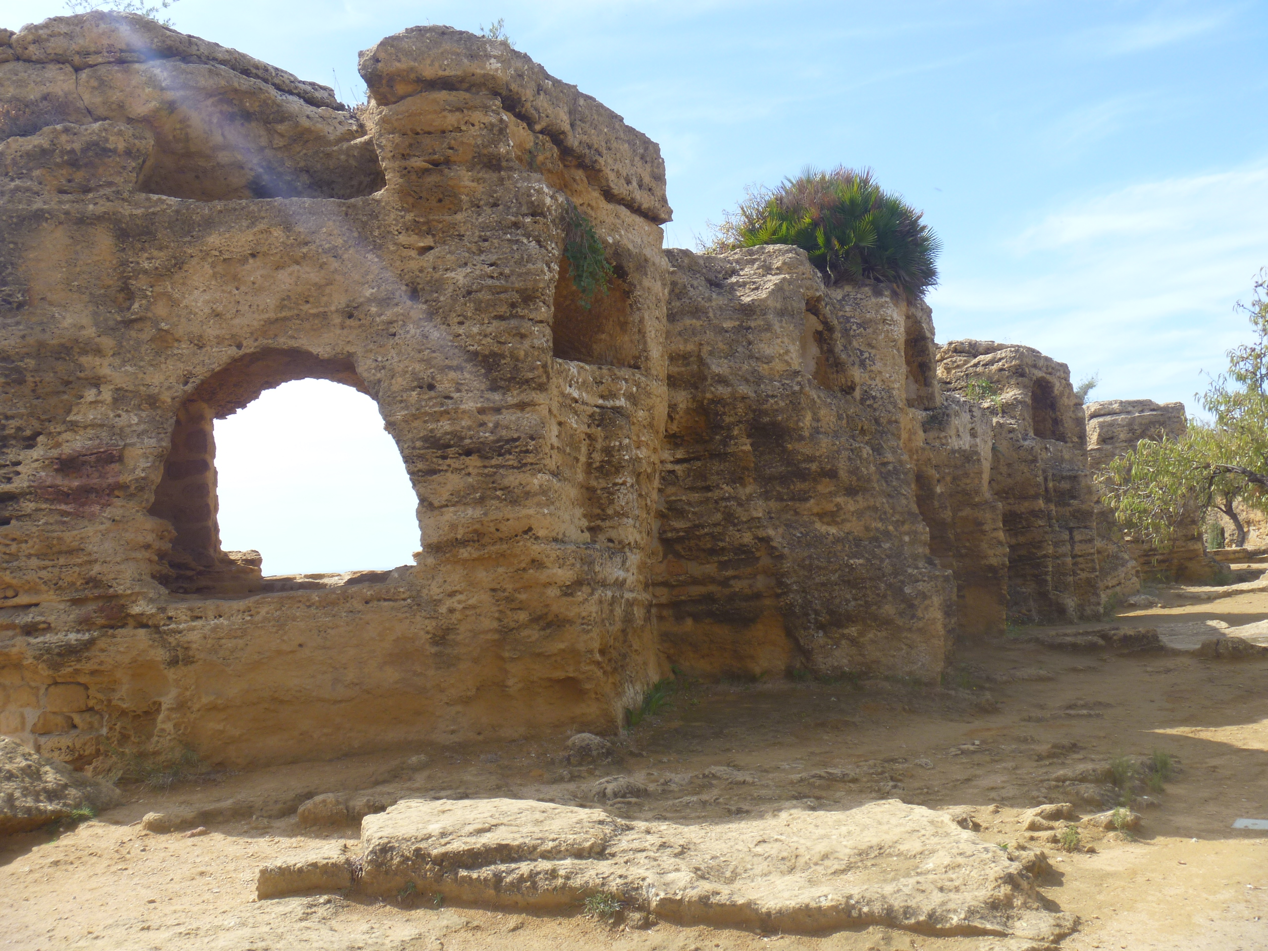 Agrigento is the most visited site in Sicily but was not nearly as crowded as some of the places we visited near Naples. Called the Valley of the Temples, it has five Greek temples built along a ridge overlooking the sea. The Temple of Concordia is most complete, and the others range from nearly complete to a heap of column fragments. A huge wall along the ridge was honeycombed with tombs carved at a later time.