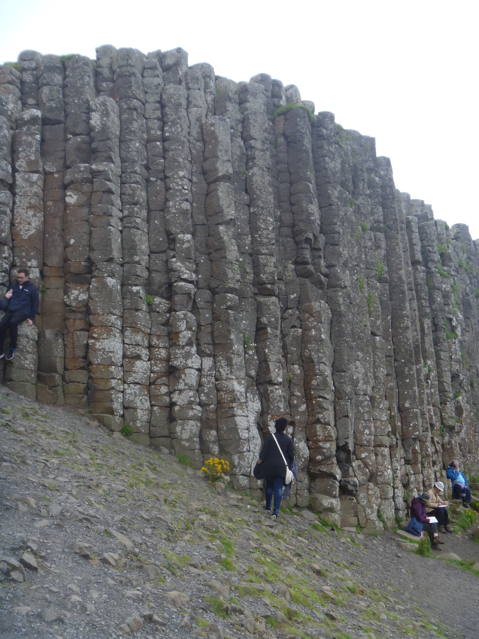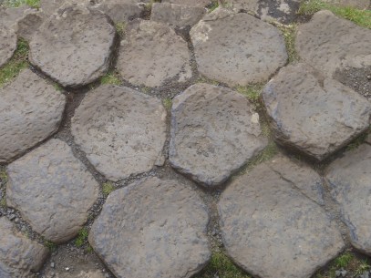 The Giant’s Causeway is made of basalt columns. The tops are visible here. On the right you see a wall at Dunluce Castle made with basalt quarried from Giant’s Causeway. They cut off the tops of the stone columns to use in the wall–the five and six-sided pieces. Notice that the man-made wall isn’t nearly as lovely as the natural formation.