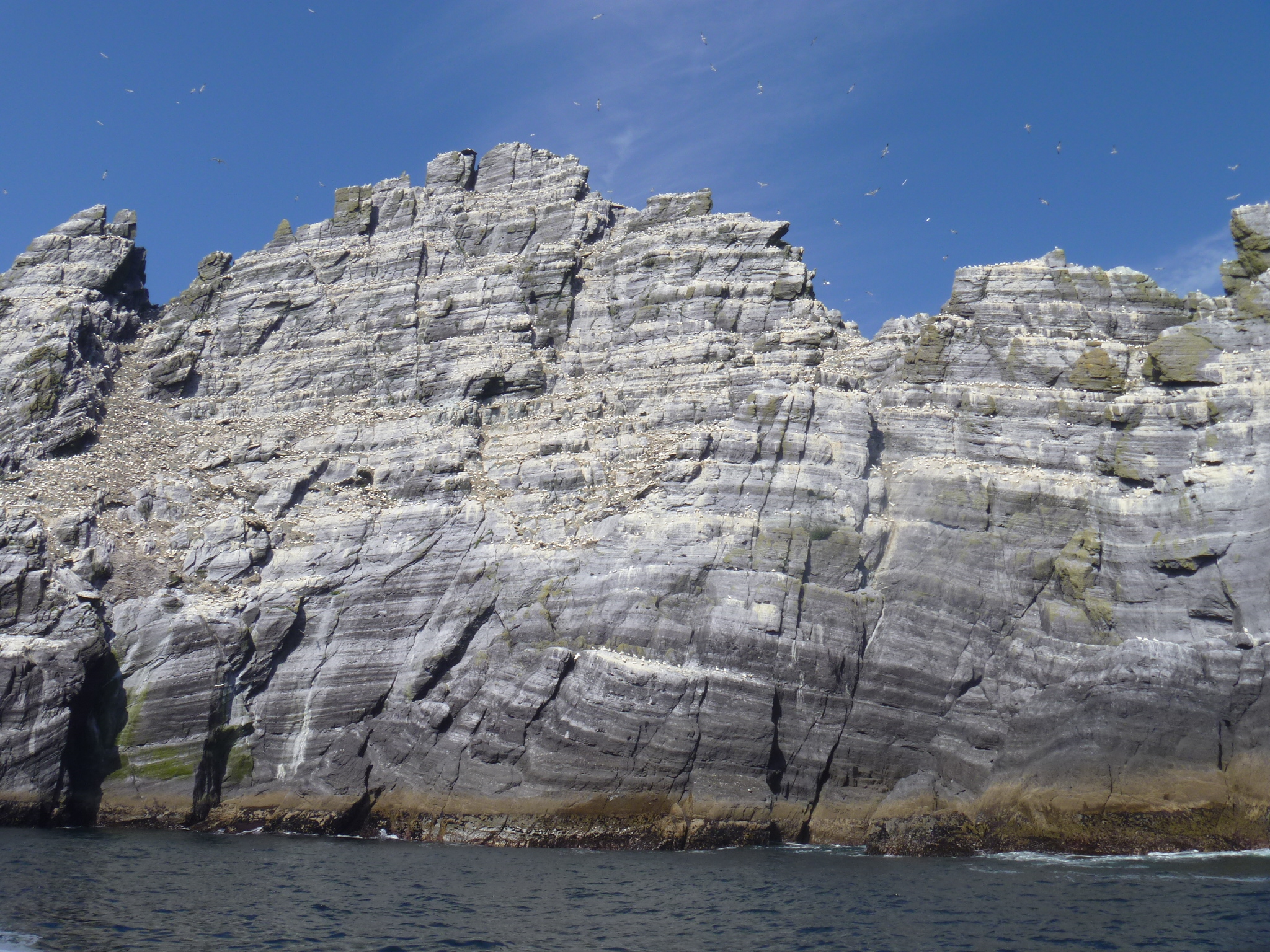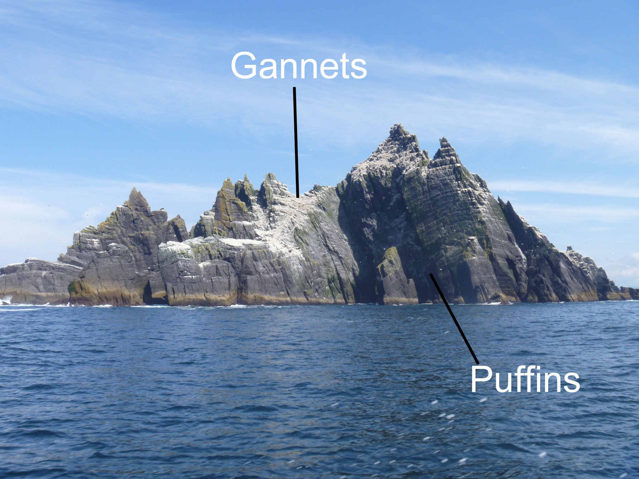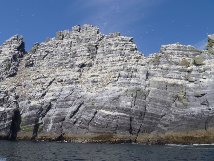 From Skellig Michael we went on to Little Skellig, a bird sanctuary. The entire surface of the island is alive with birds. This is home to one of the largest gannet colonies anywhere.Up close, you see the white area is all birds, calling, flying, wriggling and doing what birds do. The majority of the birds are gannets, but in the lowest most sheltered crevices we could see puffins.So many birds, so little time.