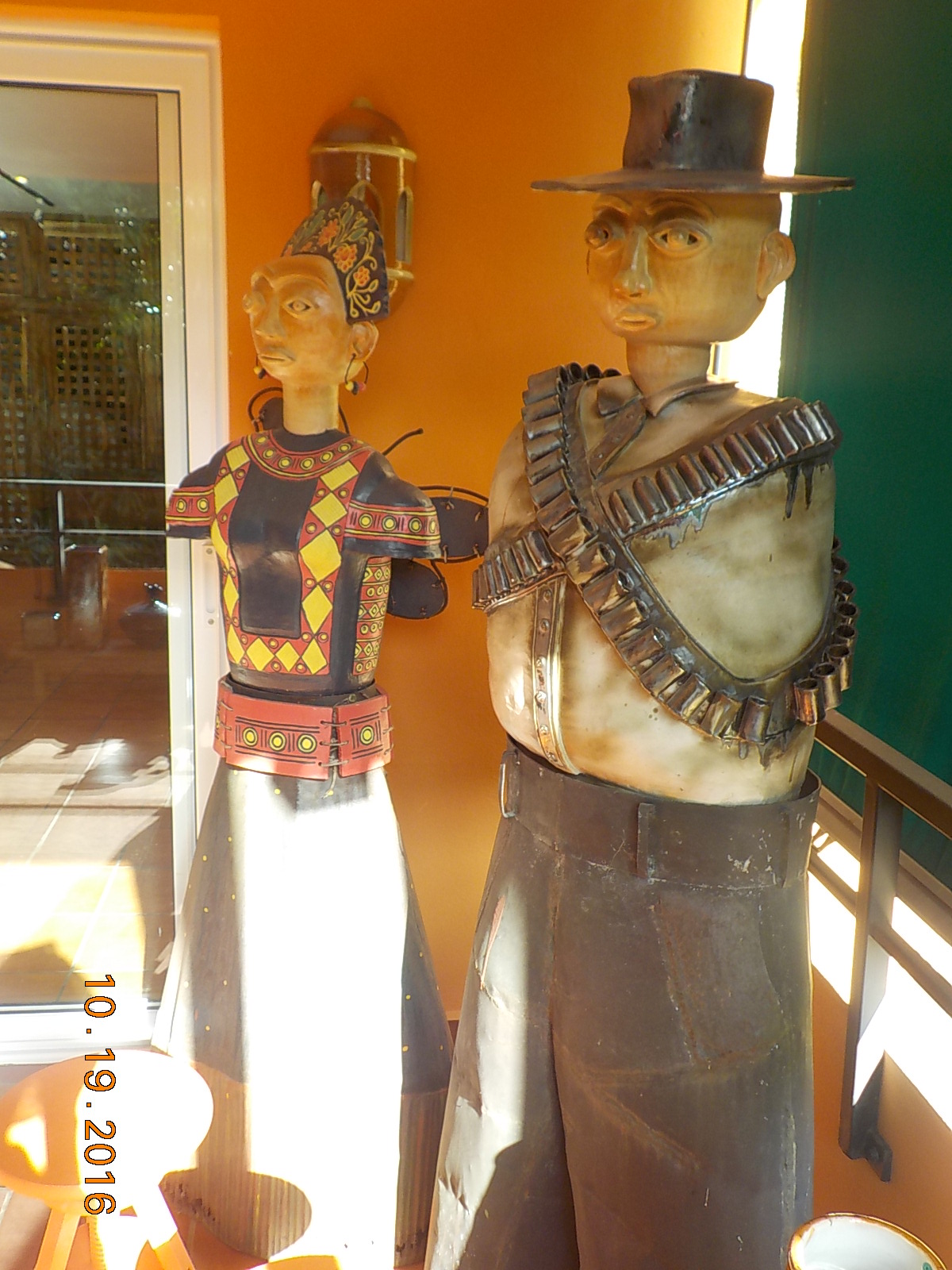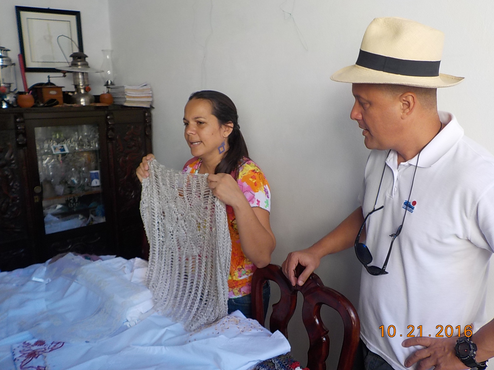 I was ready to sit under an umbrella all afternoon, but it was not to be. We were due to stop at the museum that tells the Cuban story of the Bay of Pigs and move on to our stay at “casas particulares” private home B&Bs in Cienfuegos. Jonathan and I had a room that was pretty basic, but the air conditioning worked. The public areas of the house were very pretty and airy, though we had little time to sit with our feet up. The next day we visited Trinidad, a town preserved by a big economic slump during most of the 20th century. There we walked on the old cobblestone streets, visited the architecture museum, met with a priest of Santeria, and saw the studio of a very creative woodcarver, who began using old cabinet doors as the material for his bas-relief portraits when artists materials were scarce during the 1990s and beyond. I think everyone slept on the bus back to Cienfuegos.
