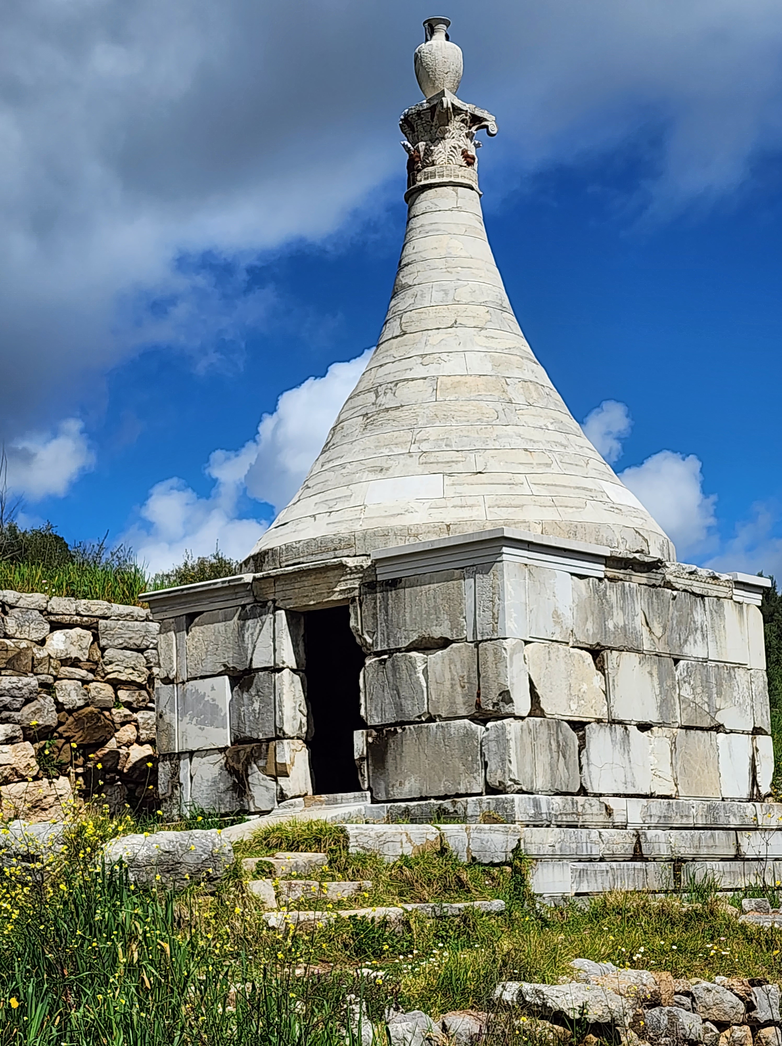 Messene also had a large stadium surrounded by colonnades, statues, markers, and stele celebrating those who participated in events at the stadium, offerings to patron gods, and efforts to invoke a winning competition. One of the monuments is unique in having a conical roof. The Messene stadium has its starting line in the curved end of the stadium, and the distance was always measured so that the finish line was in the same place–spectators got to see all the exciting parts.