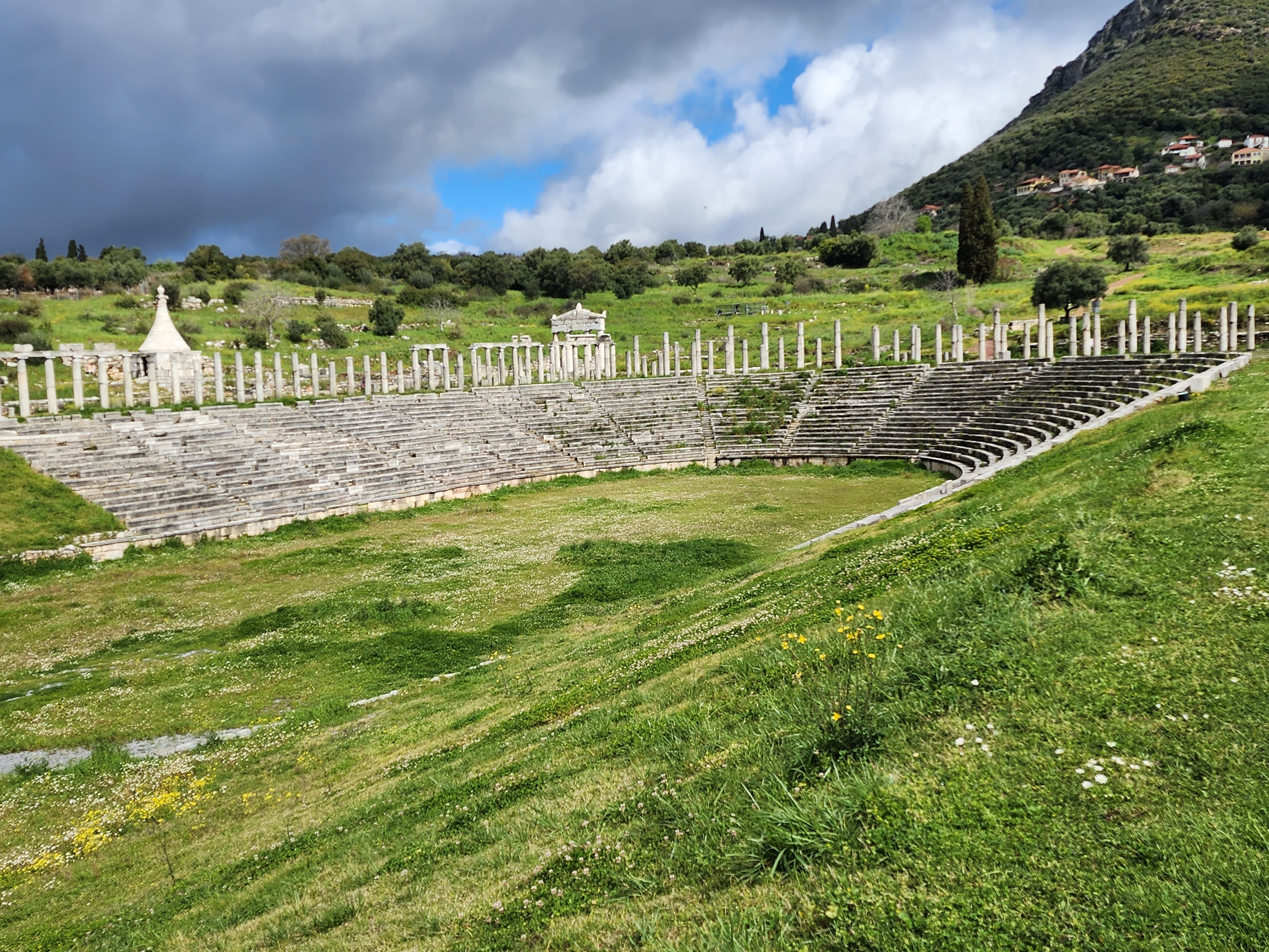 A bit of a drive later, we reached Sparta. It was drizzling, but that meant we had the site to ourselves. Sparta needs no introduction, famed for conquest, disciplined troops, and competition with Athens. We wanted to visit, because it’s Sparta. Sparta! Aristotle provided a fountain of knowledge as we looked out over the theater. Much of the remaining site is covered by olive trees, and it looks untouched, though archaeological excavations have taken place periodically since the 1890s.