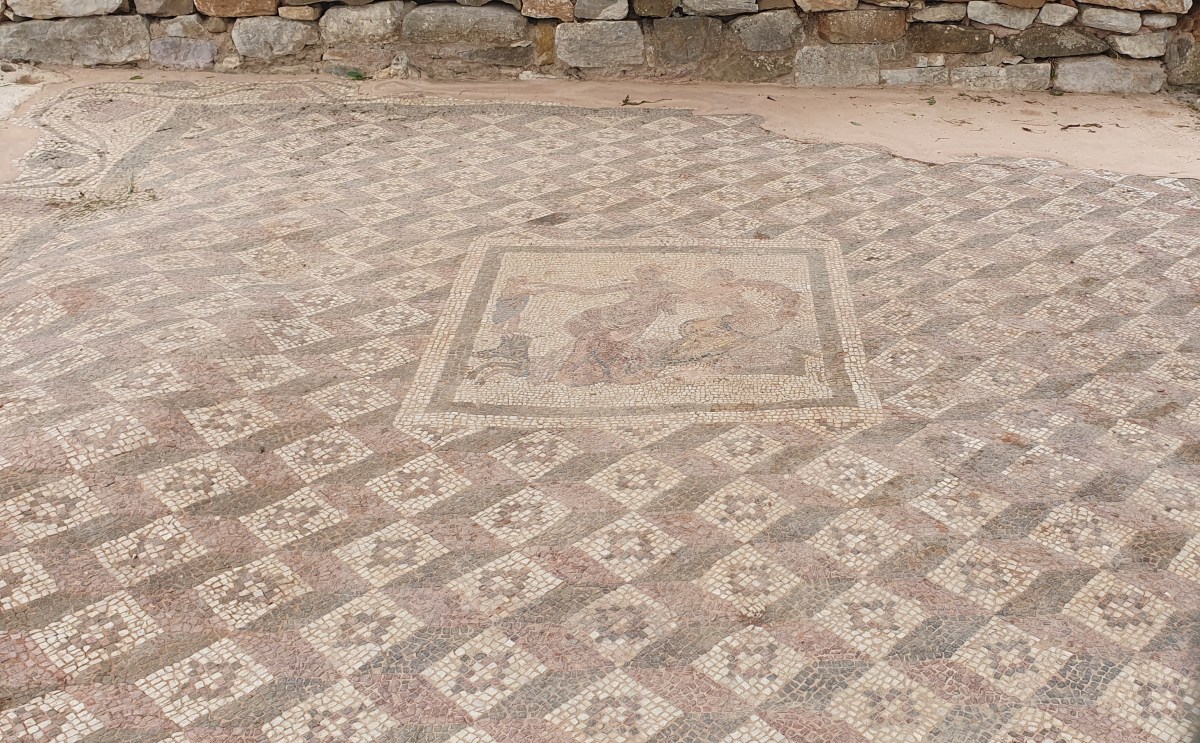 By the middle of the second century BC, Rome began to expand, and eventually took control of Greece. In Messene, that meant the addition of Roman villas to the city–the conquest seems to have been more economic than battle-driven. Some of the villas have been excavated, revealing elaborate mosaic floors like the one below.