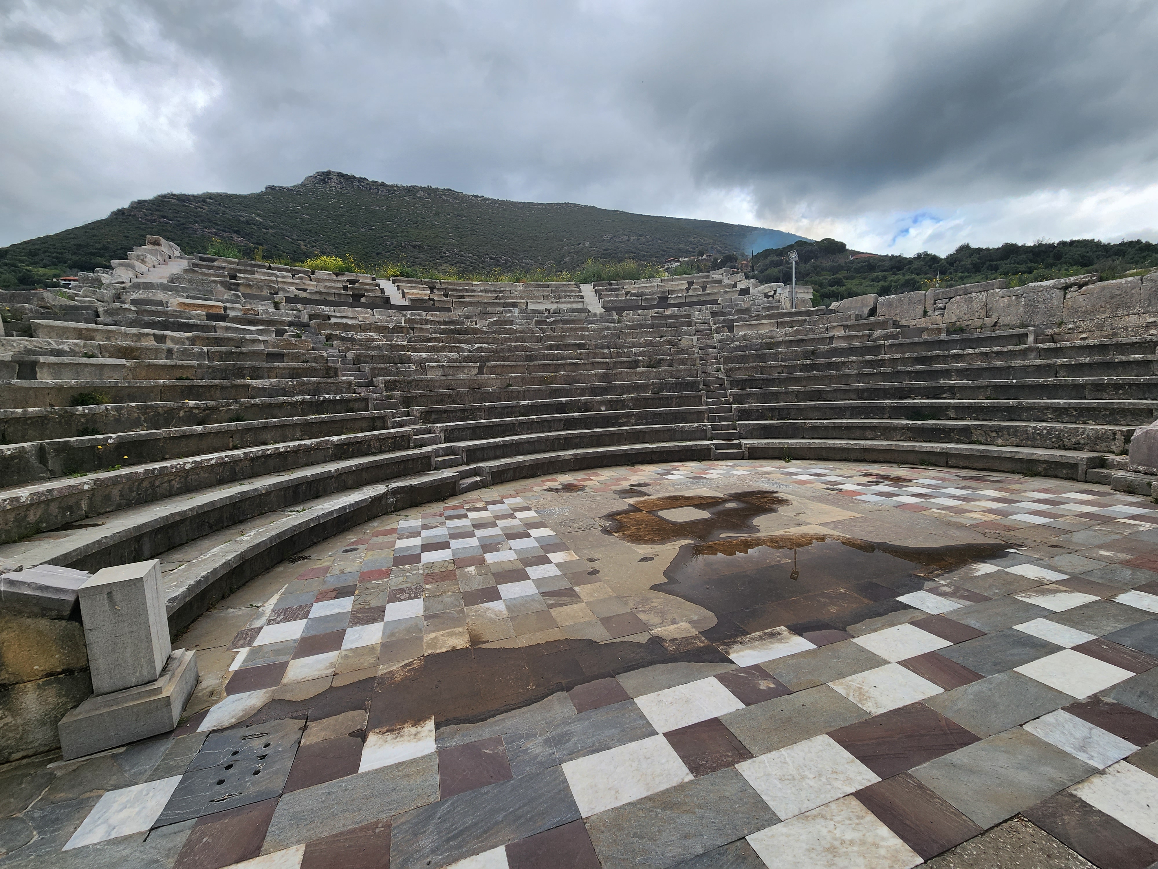 It was misty and drippy at Mystras, quite atmospheric, and we enjoyed our walk, though we did not hike as much as is possible. The hike is steep. From there we drove to Kalamata. Along the way, we stopped to see the theater at Megalopolis. Yes, there is a place with that name that is far older than any megalopolis.