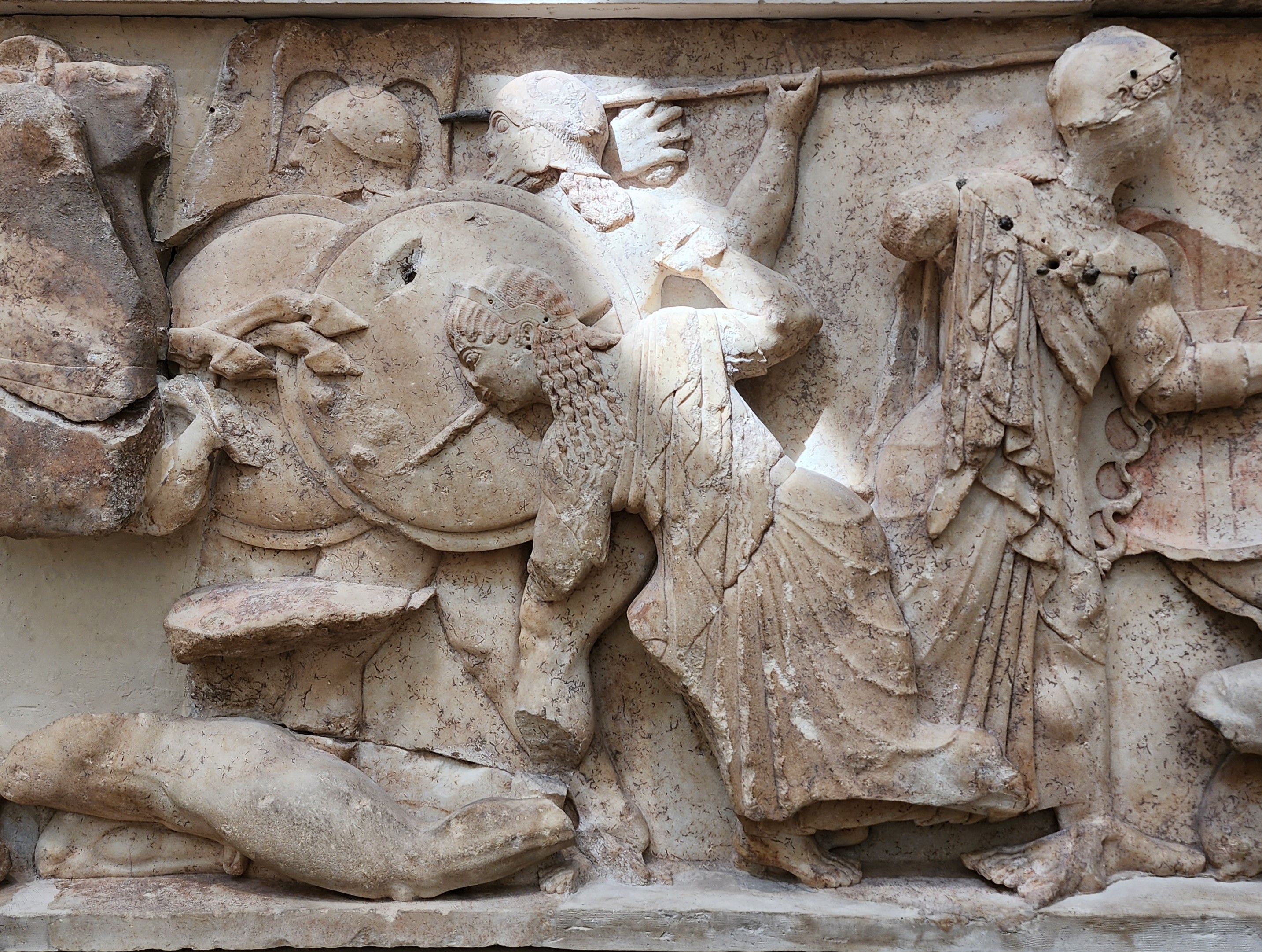 (L-R): Mosaic of a triton; carving of wild boar; “Head of the goddess Tyche (Fortune), the city goddess of Sparta. Her tower-like turreted crown has relief representations of the walls of the city.
