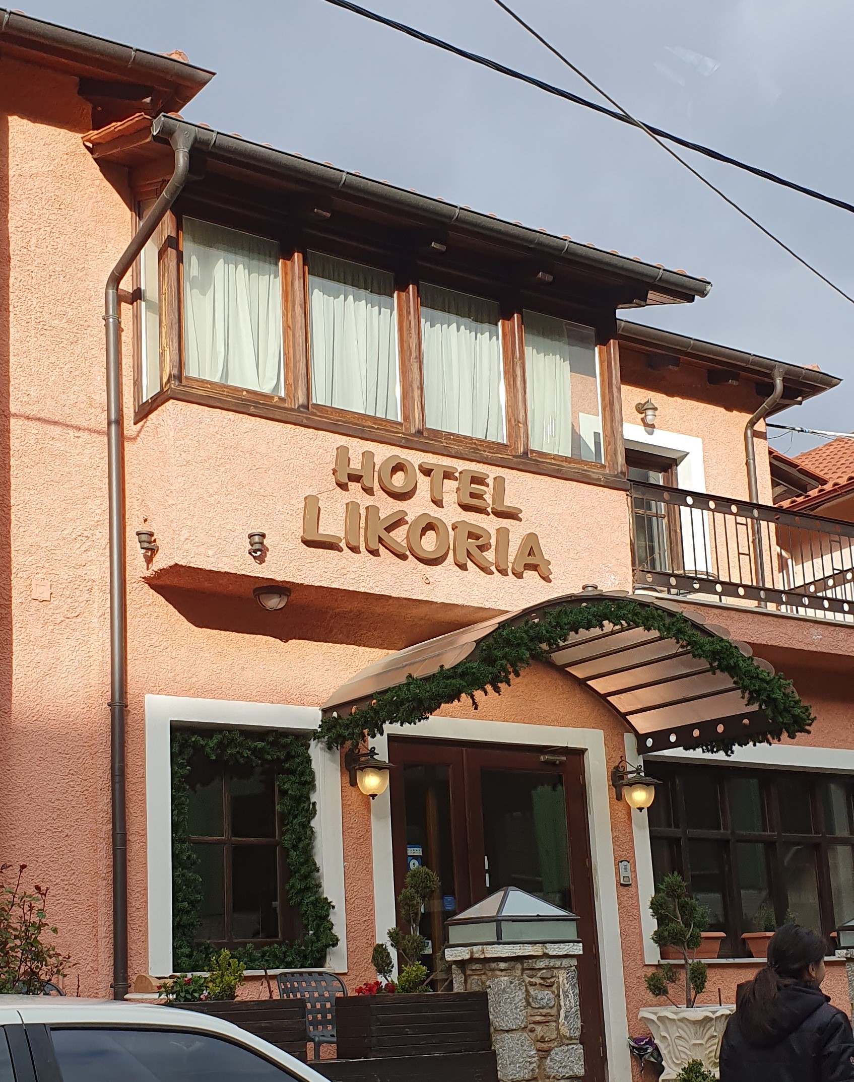 L-R: The town perches in the background of the Arachova sign; Our hotel.