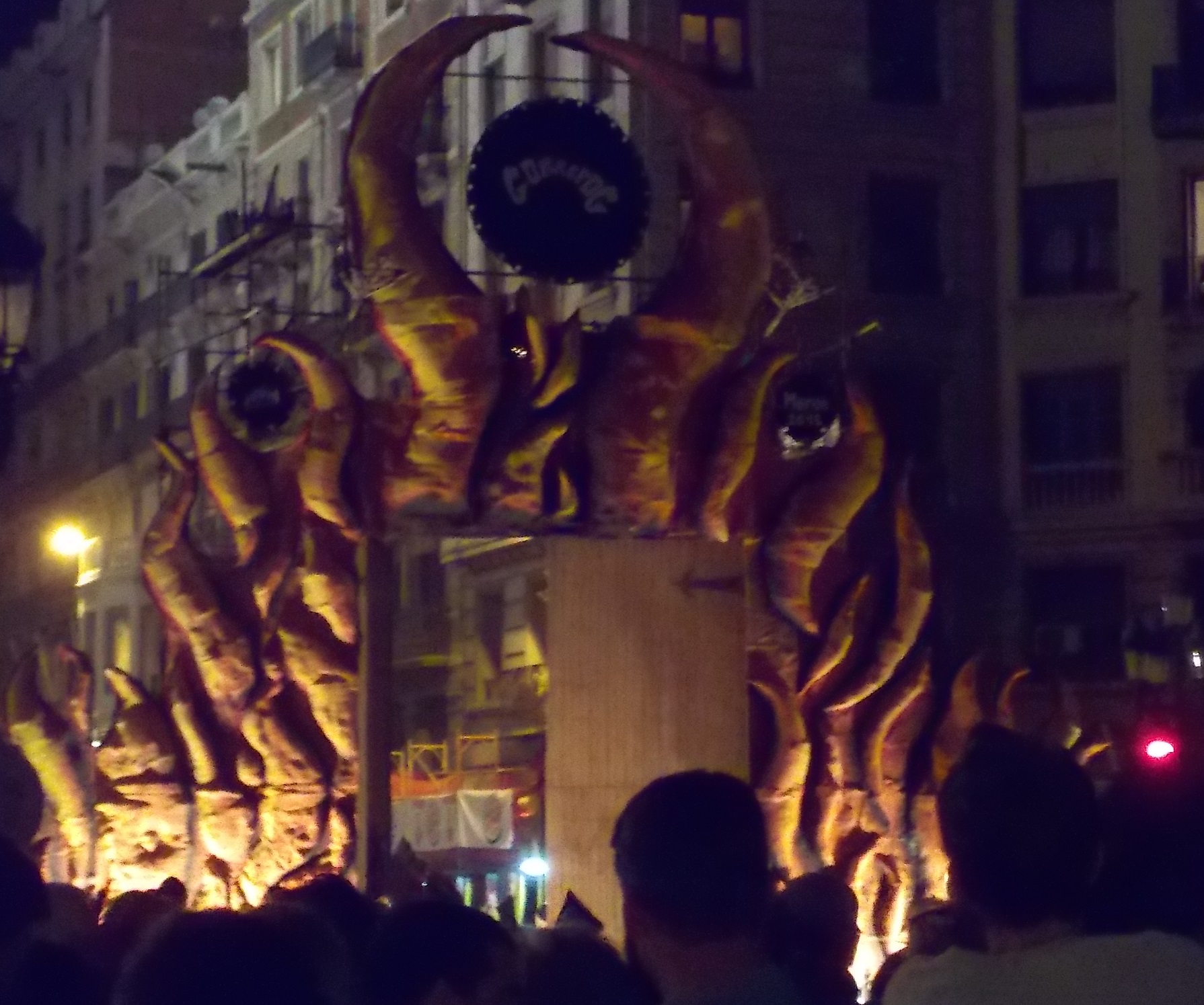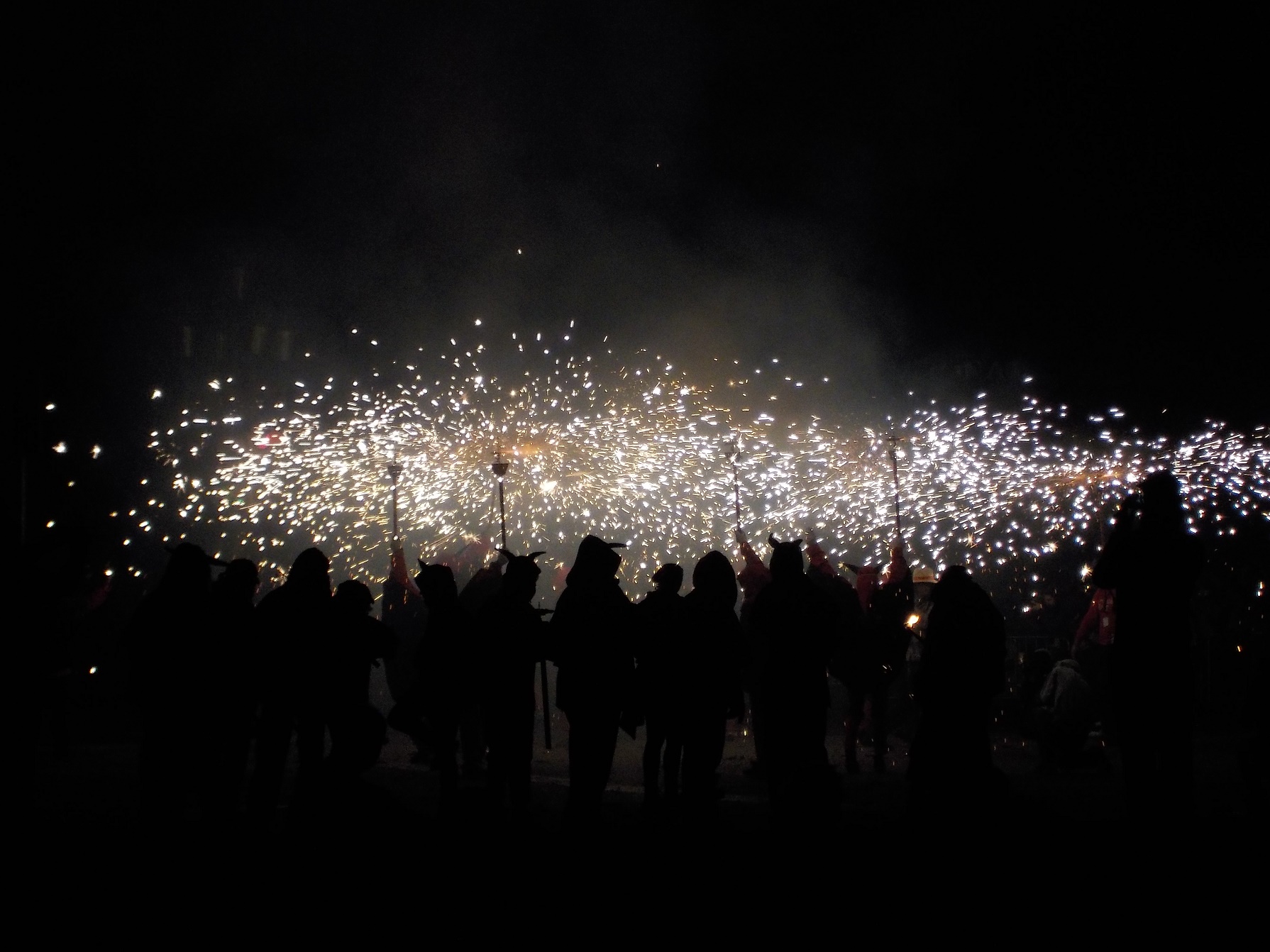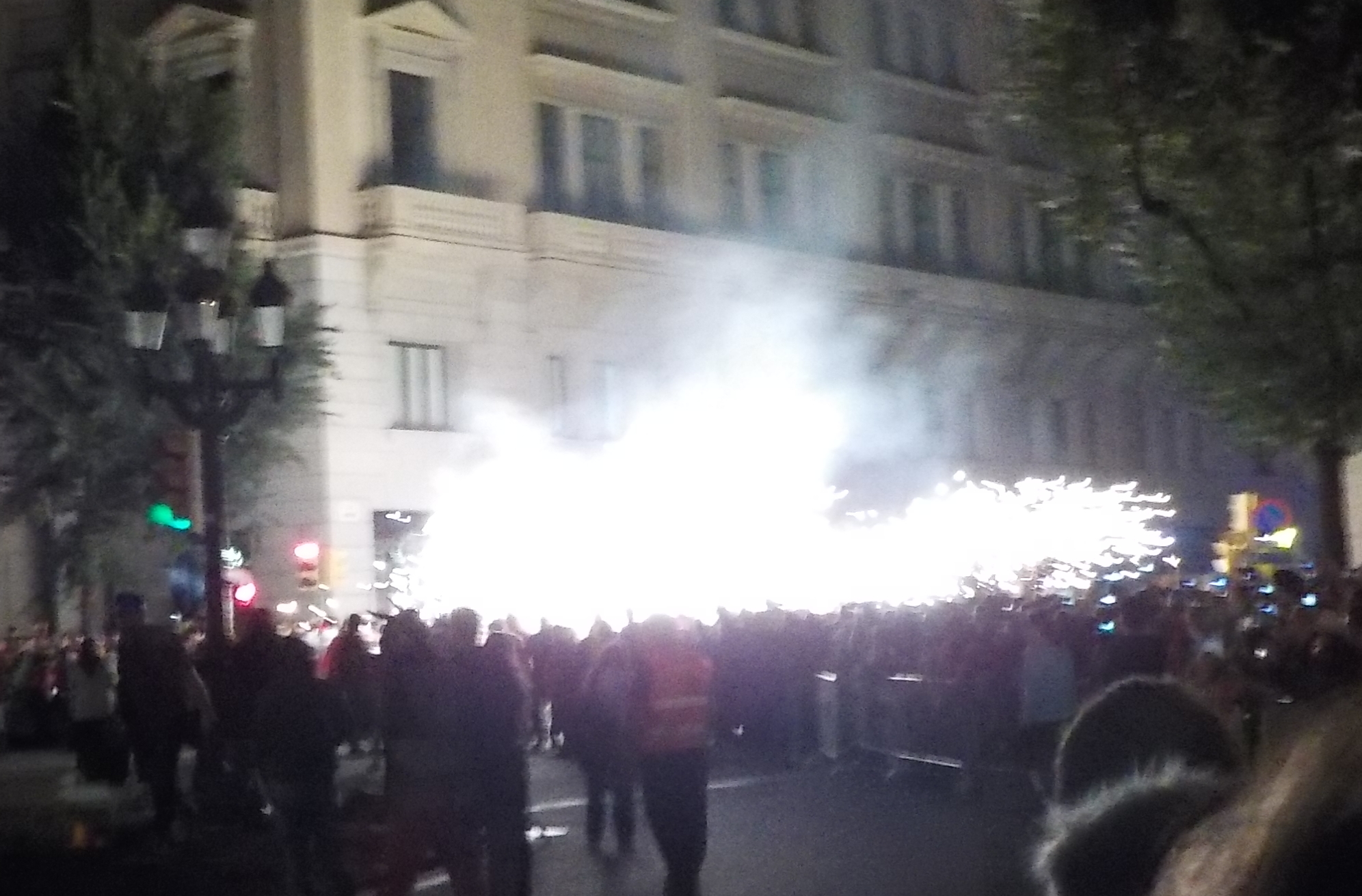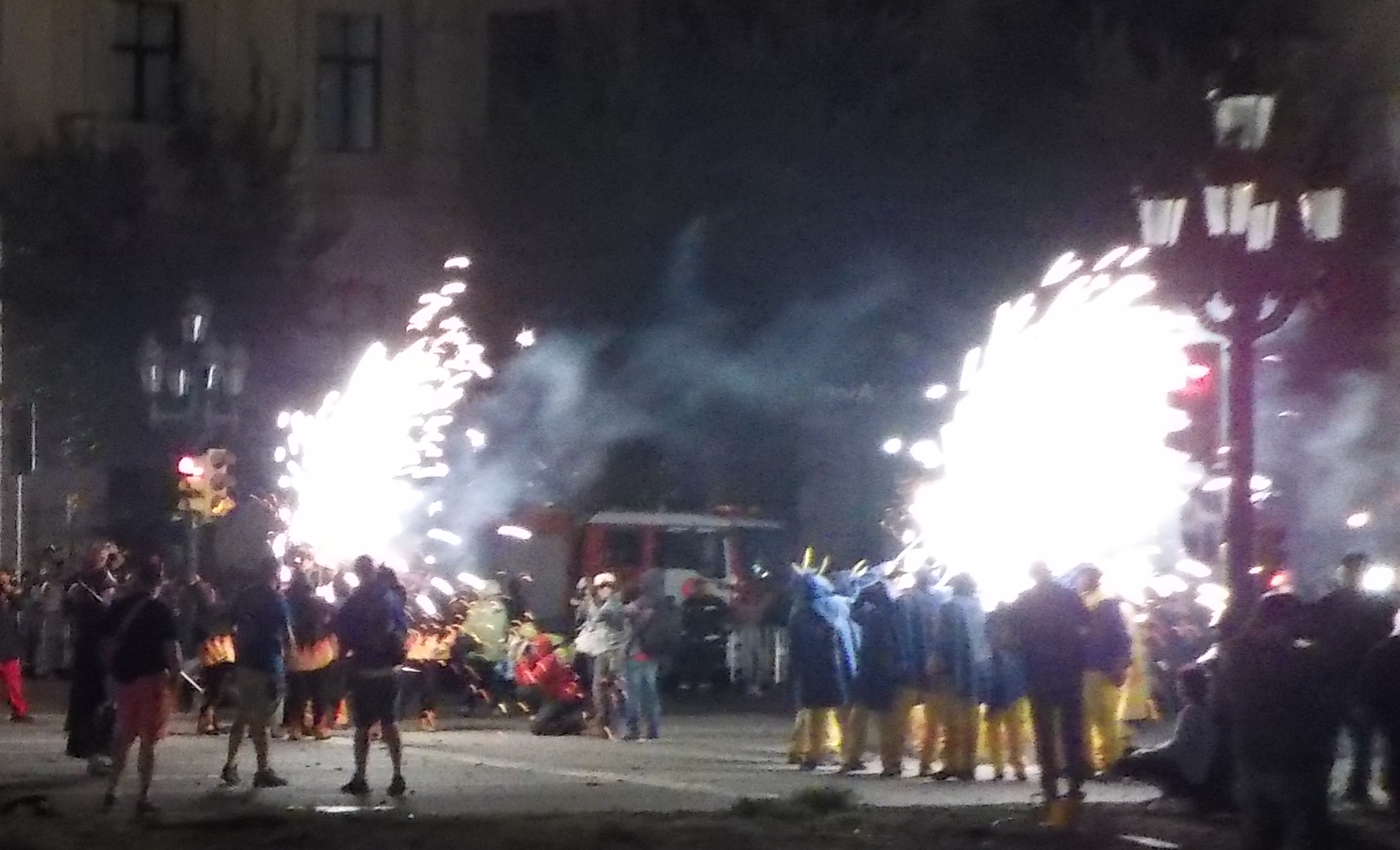 There is never a tranquil moment. It’s all out noise, drums, sparklers crackling, explosions and chanting. Groups take turns to enter through the gates, light up, and scare everyone along the parade route. Just another fun evening in Barcelona during a religious festival.