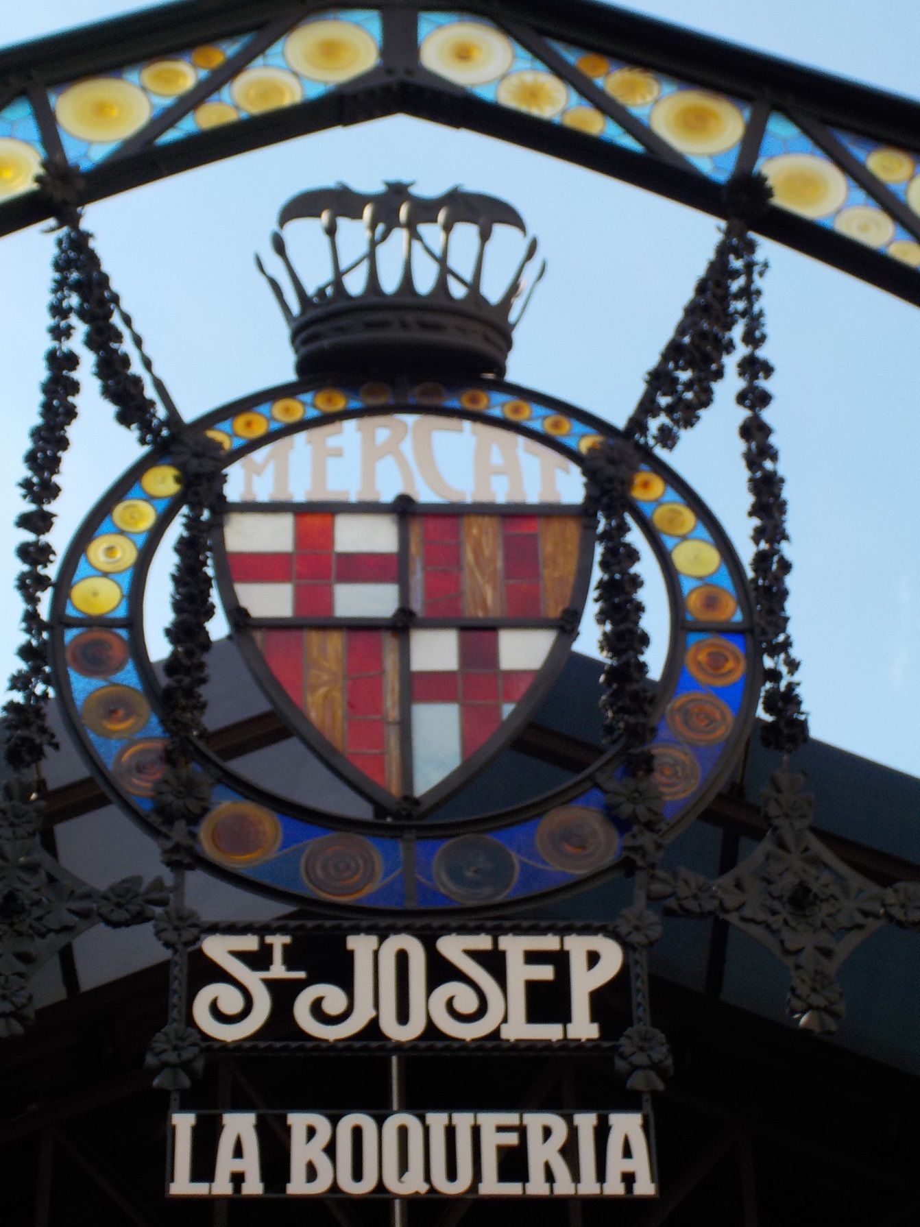 The Boqueria Market is one of the dozen open air markets in Barcelona. The logo and entrance archway in stained glass are considered to be moderniste.