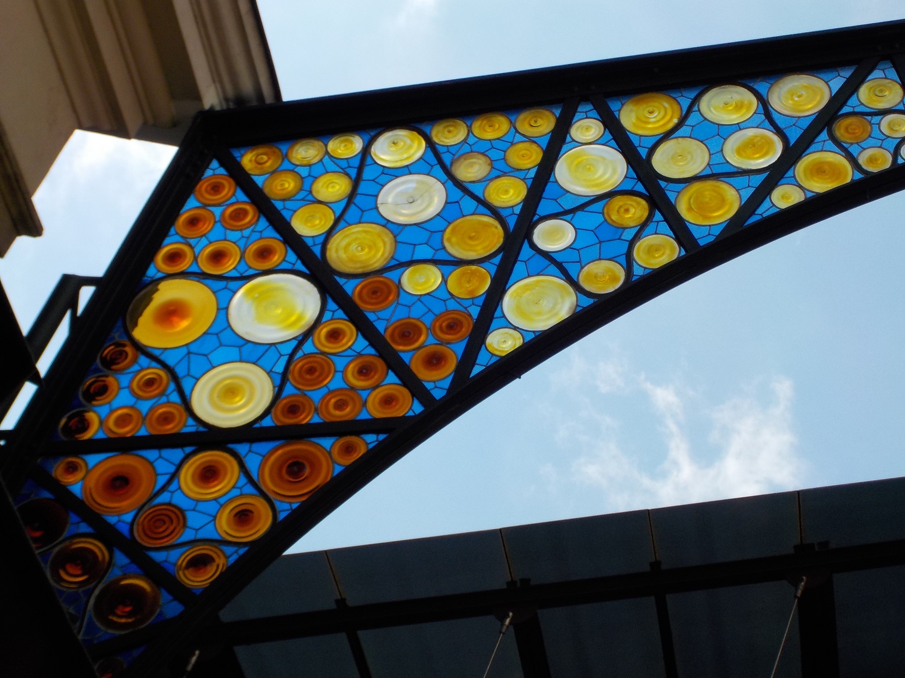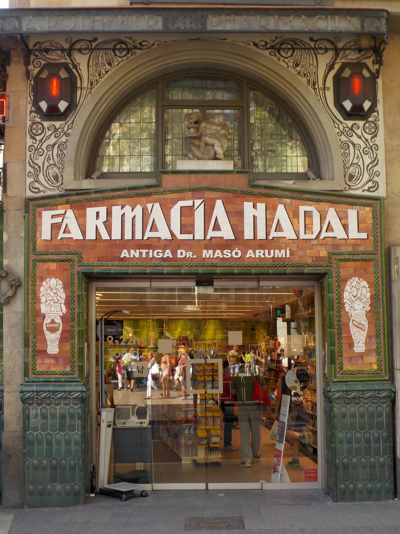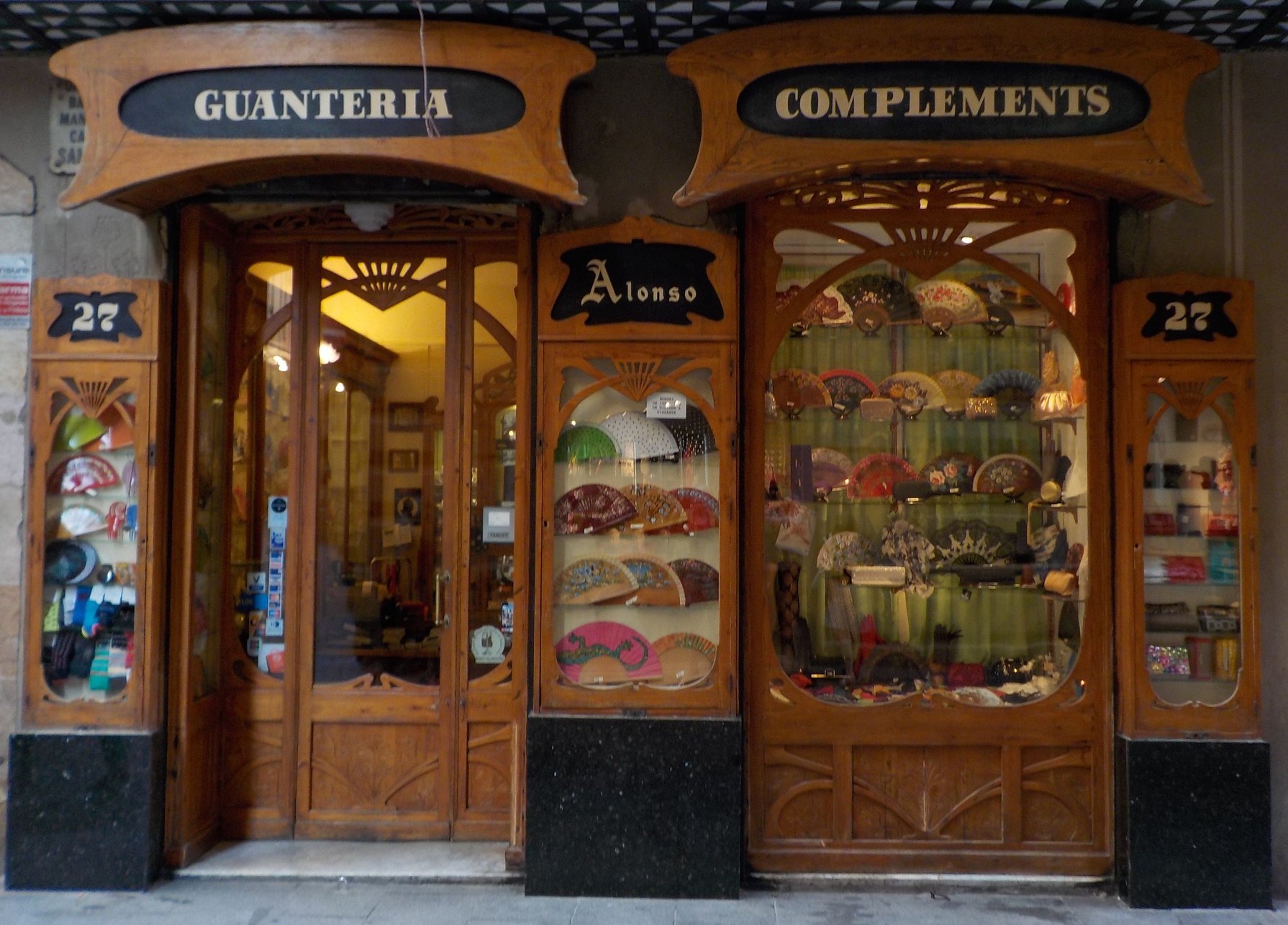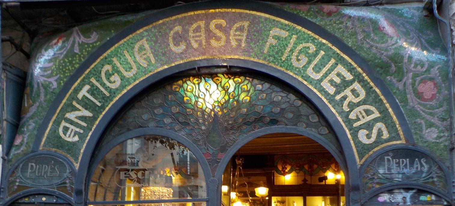 Since there are more than 100 structures considered moderniste (anything not strictly classical), I’ll keep adding interesting images. Stop back again. The rounded corners at the top of this storefront are covered with mosaic tile, a feature of Gaudi-era (Catalan modernisme) structures (1880s through the early 20th century). The original occupant was a pasta maker. Today it is a bakery. The close up shows the stained glass peacock between the doors.